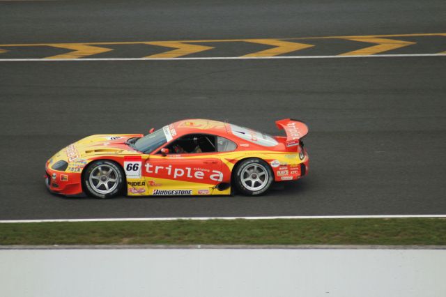 | 9時半からのフリー走行。バスが何台も同じコースを走ります。危ねえじゃねえか。信じられねえ。 | ECLIPSEスープラ。 | ZENTセルモSC。スポンサーの紹介を頼まれたのに、良い所が見つかりませんでした。 | 昨年のチャンピオンマシーンなのでゼッケン1。シャッター速度が速すぎて背景が流れない。 | ECLIPSEスープラ。 |