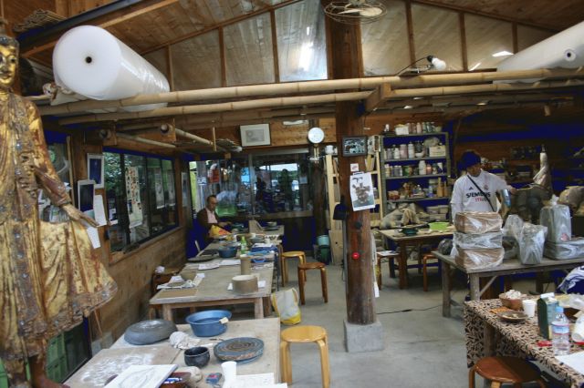 | 増穂登り窯に着きました。愛車レガシィ2.0GTと田代夫妻のウィザード。 | 鉄の芸術家、熊さん作成のモニュメント。 | 12人が参加して、合宿です。 | ここが工房。 | 池田満寿夫もここで作陶していたのです。 |