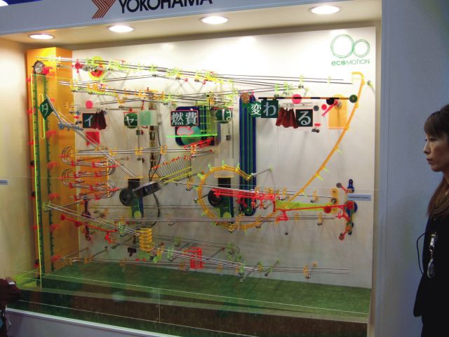 | - | 横浜タイヤ。どうってことないアイデアだけれど、色と動きが楽しい。 | トヨタ車体。環境に良い樹脂の説明。東レもこれぐらい楽しそうに作らないとね。 | - | リグニン樹脂だって、私ゃ知らない。 |