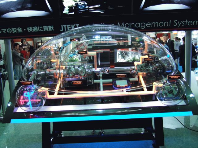 | ステアリングシステムが林立して生き物のよう。同じ展示でもセンスが良いとこうなります。 | むむむ、何ともはや。 | アイシン精機、今年は例のワイヤーカーを止めたらしい。 | このカットモデルもなかなか精巧です。 | 表示も洒落ています。 |