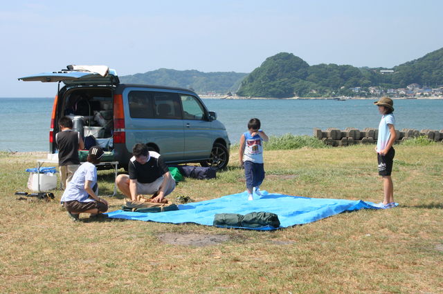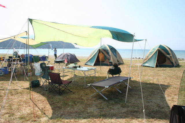 | 鯉のぼりが我がチームの目印。 | 初参加のカメチャン一家。 | みんなでテント張り。 | - | おじさんも若者も、そして小学生も仲間です。 |