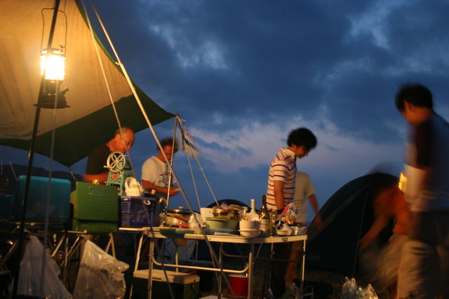 | いいんちょさん、走ると酔いが回るぞ。 | これこれ、ストロボやめて長時間露光すると、良い空の色。 | - | いい絵なんだけど、露光時間が長いとブレるわ。人間の目はカメラより凄い。 | 夕暮れの空の下、酒と話は進み、時は静かに過ぎていく。 |