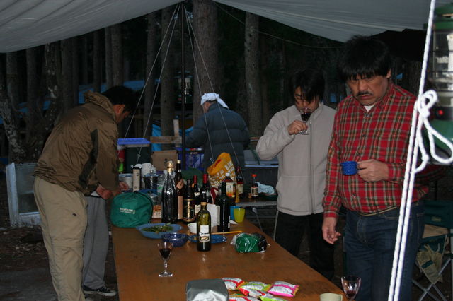 | 一日の昼ごろから、三々五々車が集まりだします。 | この三方の話題はチコンキ。 | 年代物を持ち寄って、妙なる音を聞かせてくれます。 | - | タープの下ではそろそろ酒盛り。 |