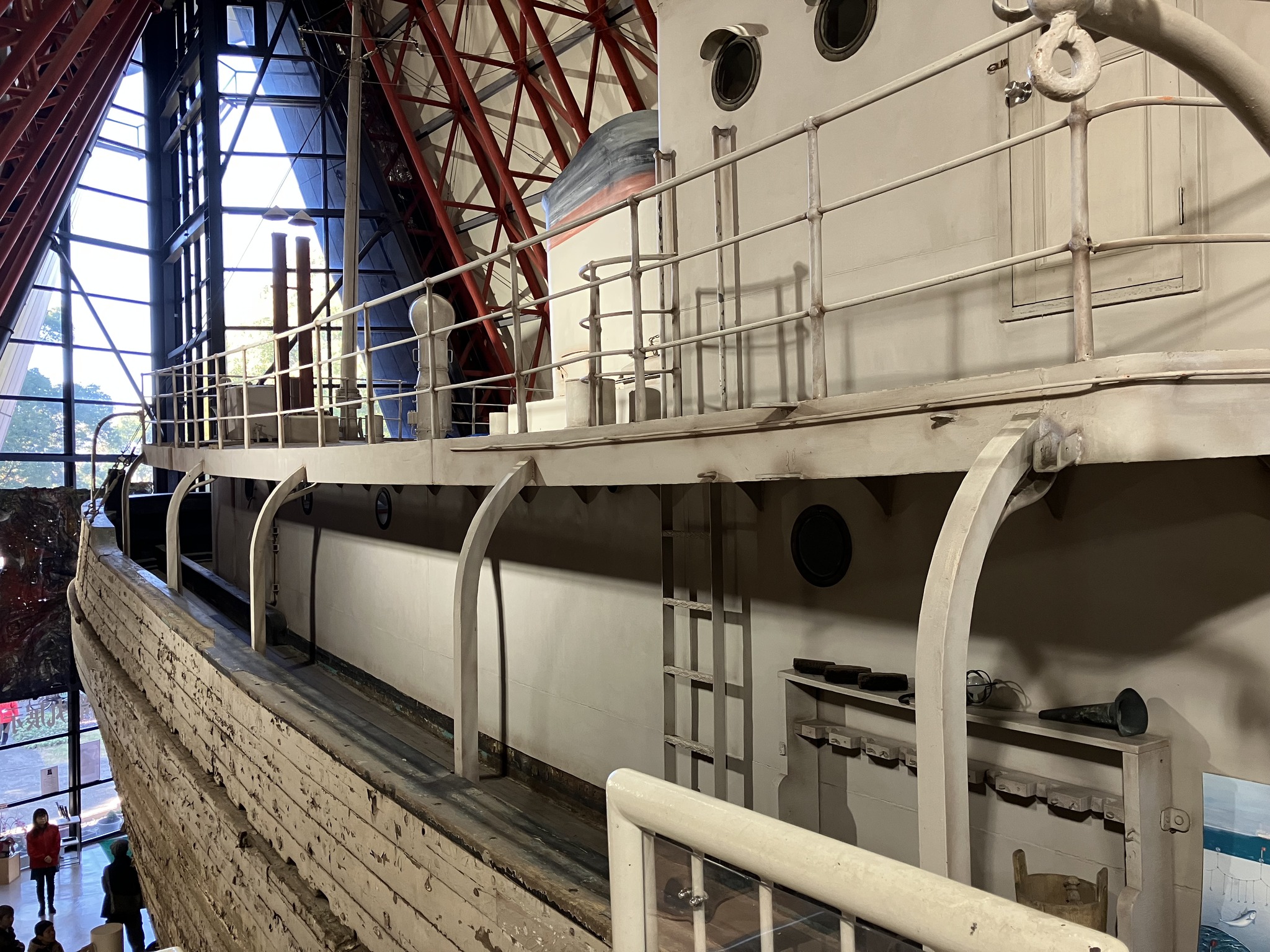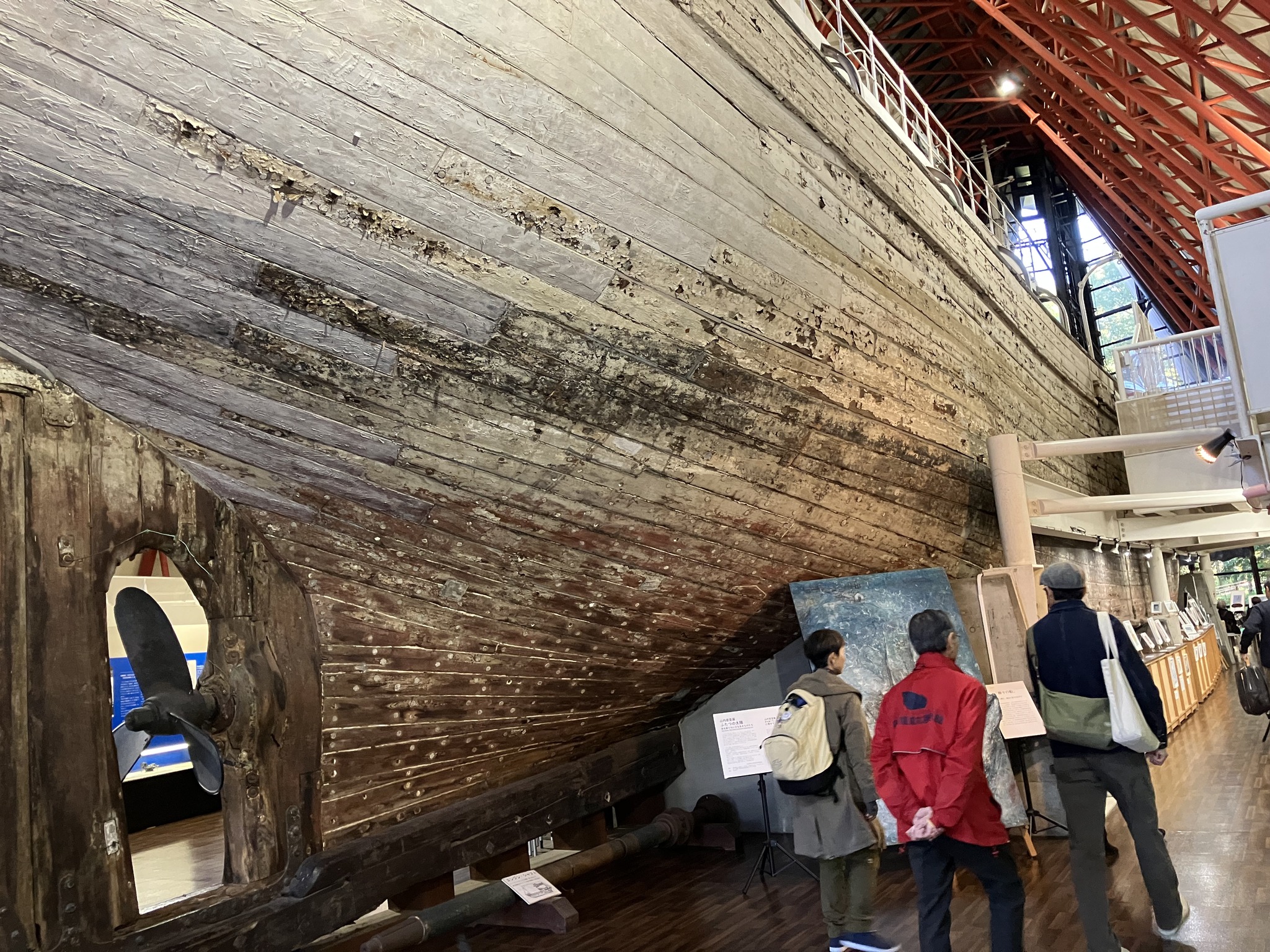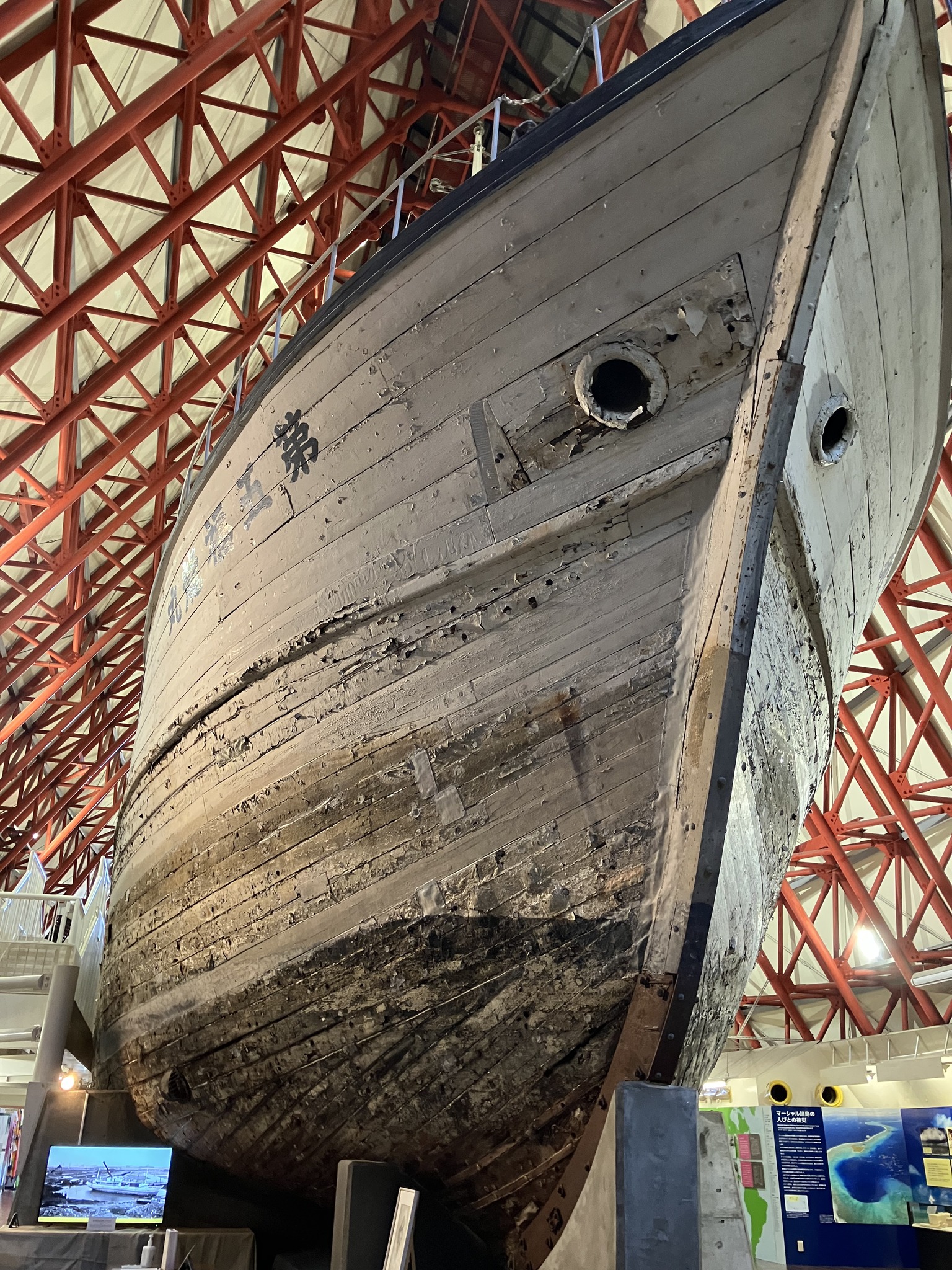 | 夢の島のゴミ捨て場に捨てられていた。それを展示館に納めたのだから、市民と都は偉い。 | なんか素晴らしい造形だ。 | 船首。 | 船尾に向かって。 | 船首甲板。 |