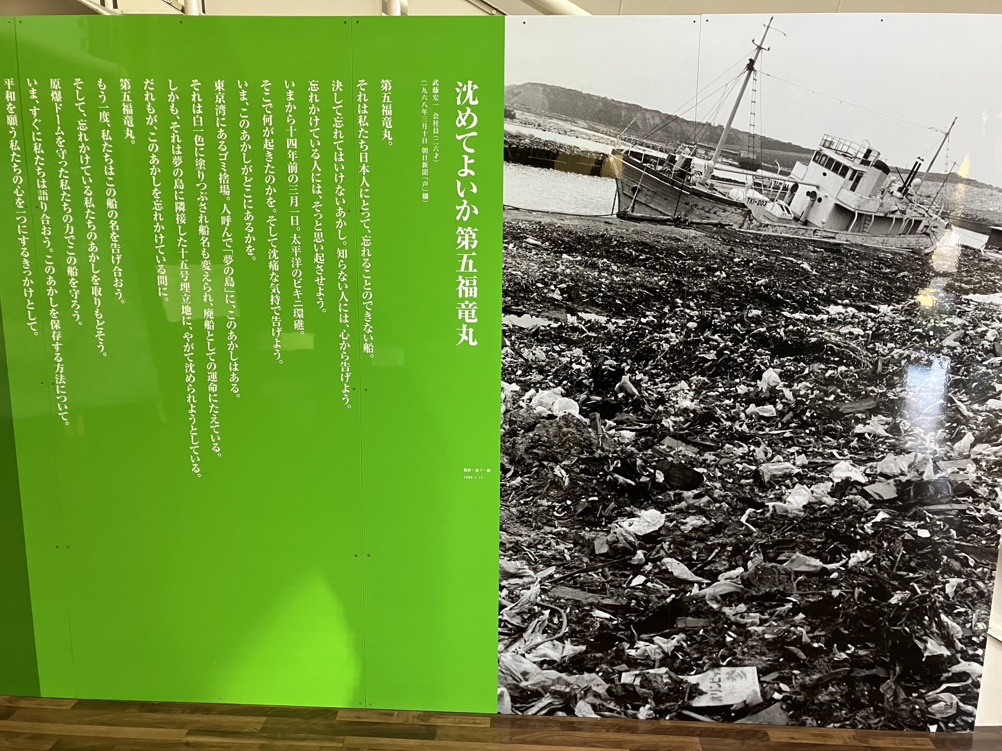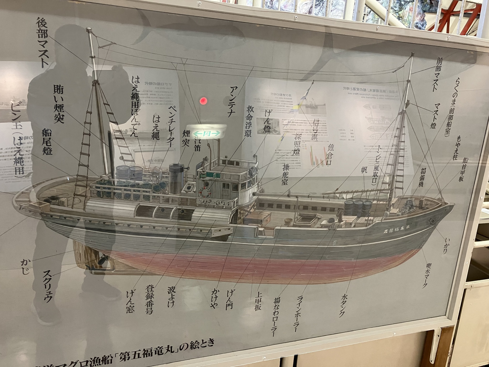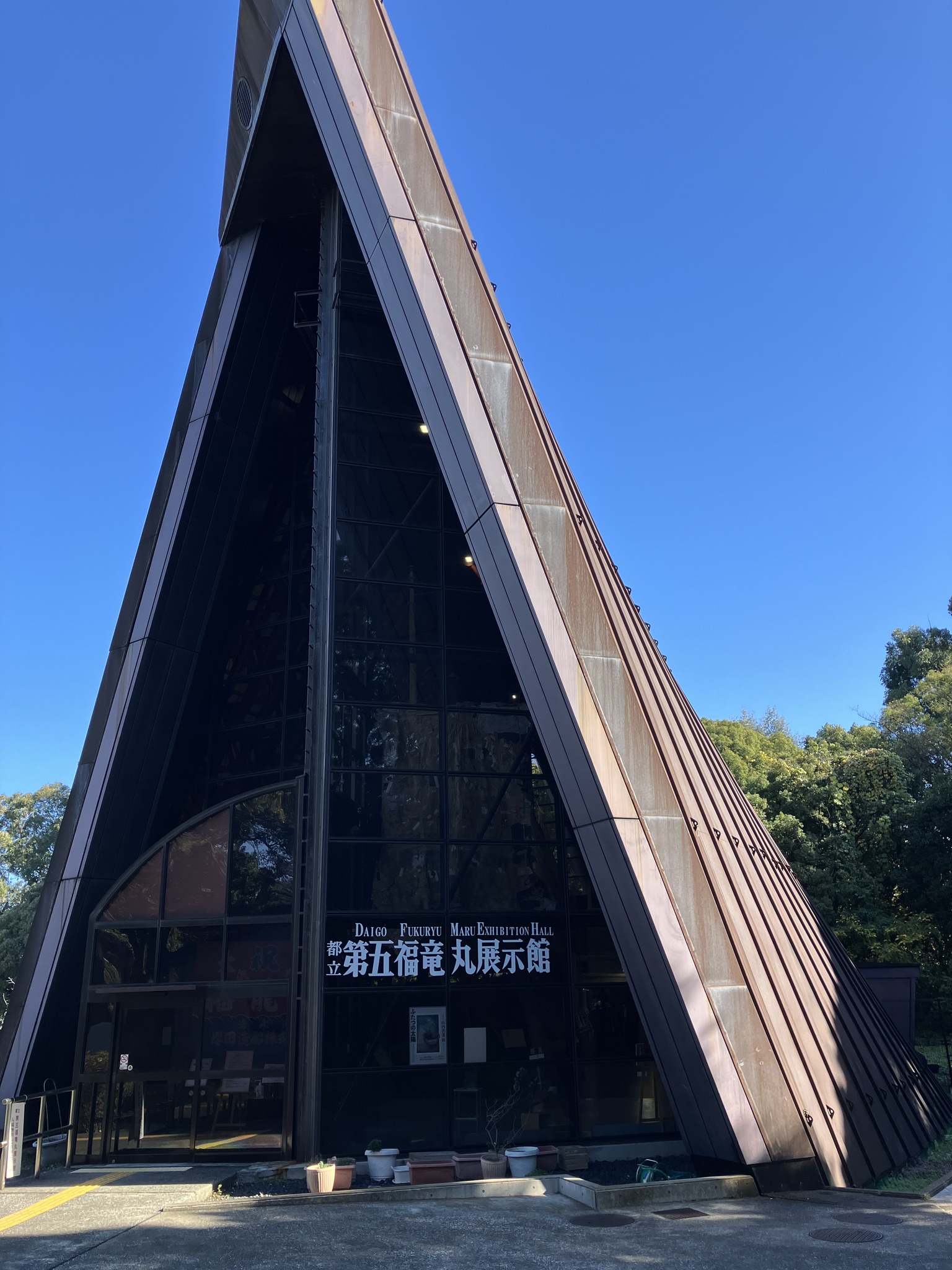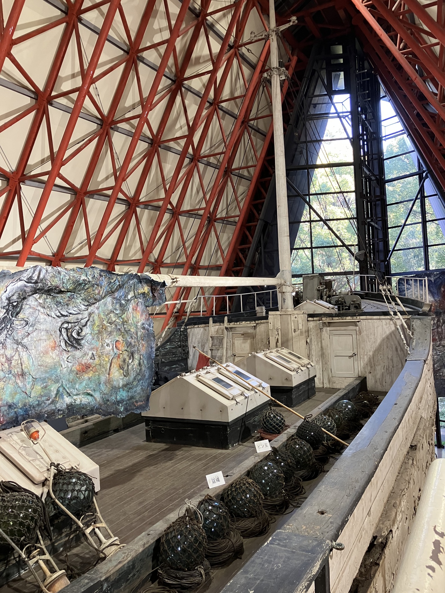| 夢の島のゴミ捨て場に捨てられていた。それを展示館に納めたのだから、市民と都は偉い。 | なんか素晴らしい造形だ。 | 船首。 | 船尾に向かって。 | 船首甲板。 |
