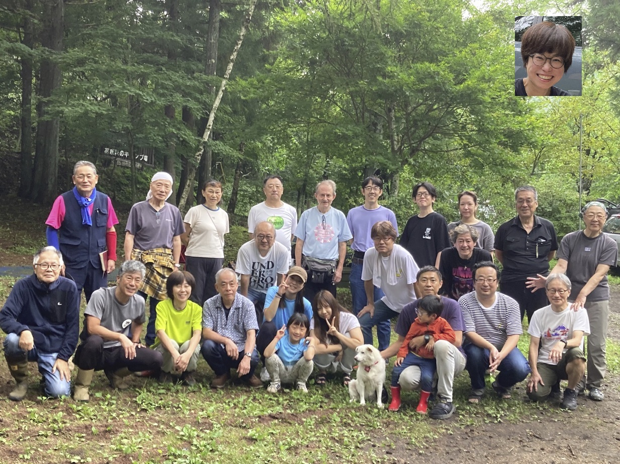 | 楽しいクリスは、今回もウエストポーチ紛失事件で皆んなを慌てさせ、千葉さんが発見。真面目な千葉さんはキャンプの大黒柱。 | 解散前に記念写真。一泊で帰ったこてっちゃんの遺影?を、千田さんが追加。 |