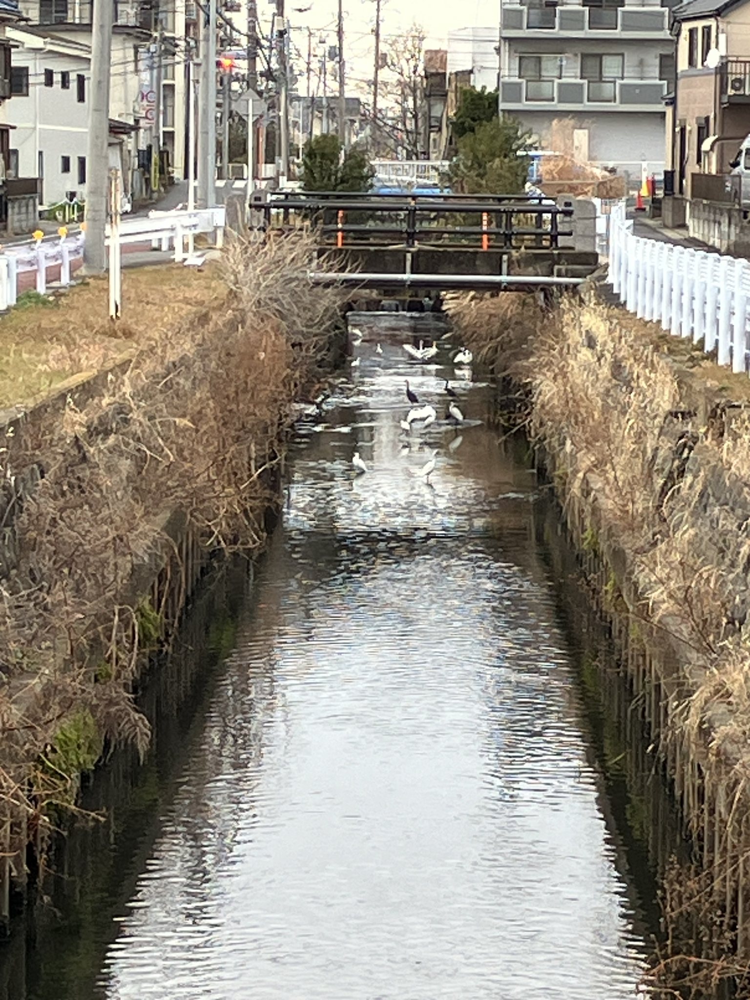 | 何じゃこりぁ、ボラの子か。ここで初めて見るぞ。 | こんな狭い春木川に。あそこは曽谷橋で、段になっているからそれ以上遡上出来ないぞ。白鷺も待っているし。 | 白鷺さんたち、舌舐めずりで待ってるぜ。 | いつもの調整池は天気は良いが、芦の冬枯れ模様。ボラもここに入ると生きていけるのかしら。 | 24時間経ってもう居ないかと思ったけど、居ました。 |