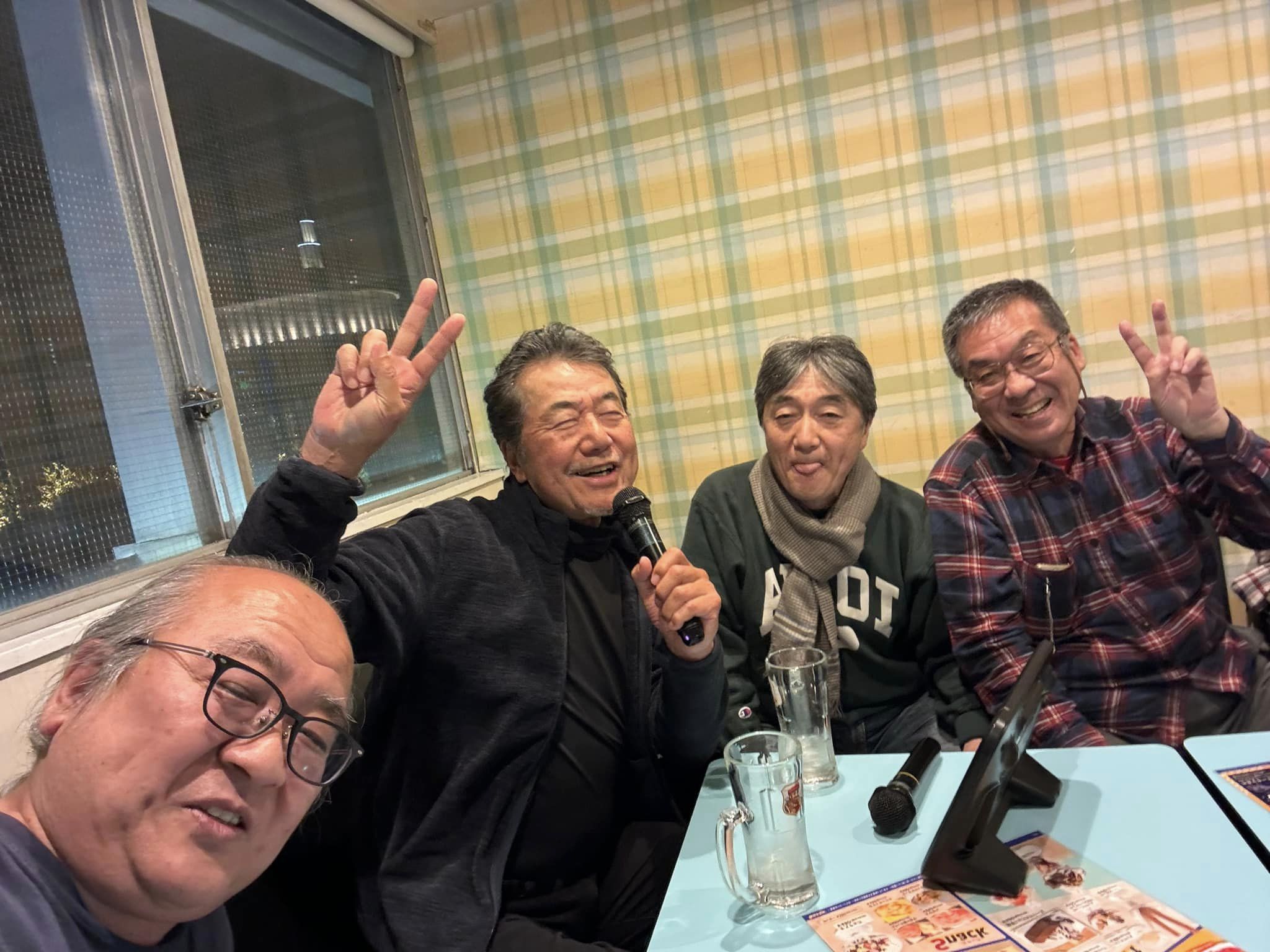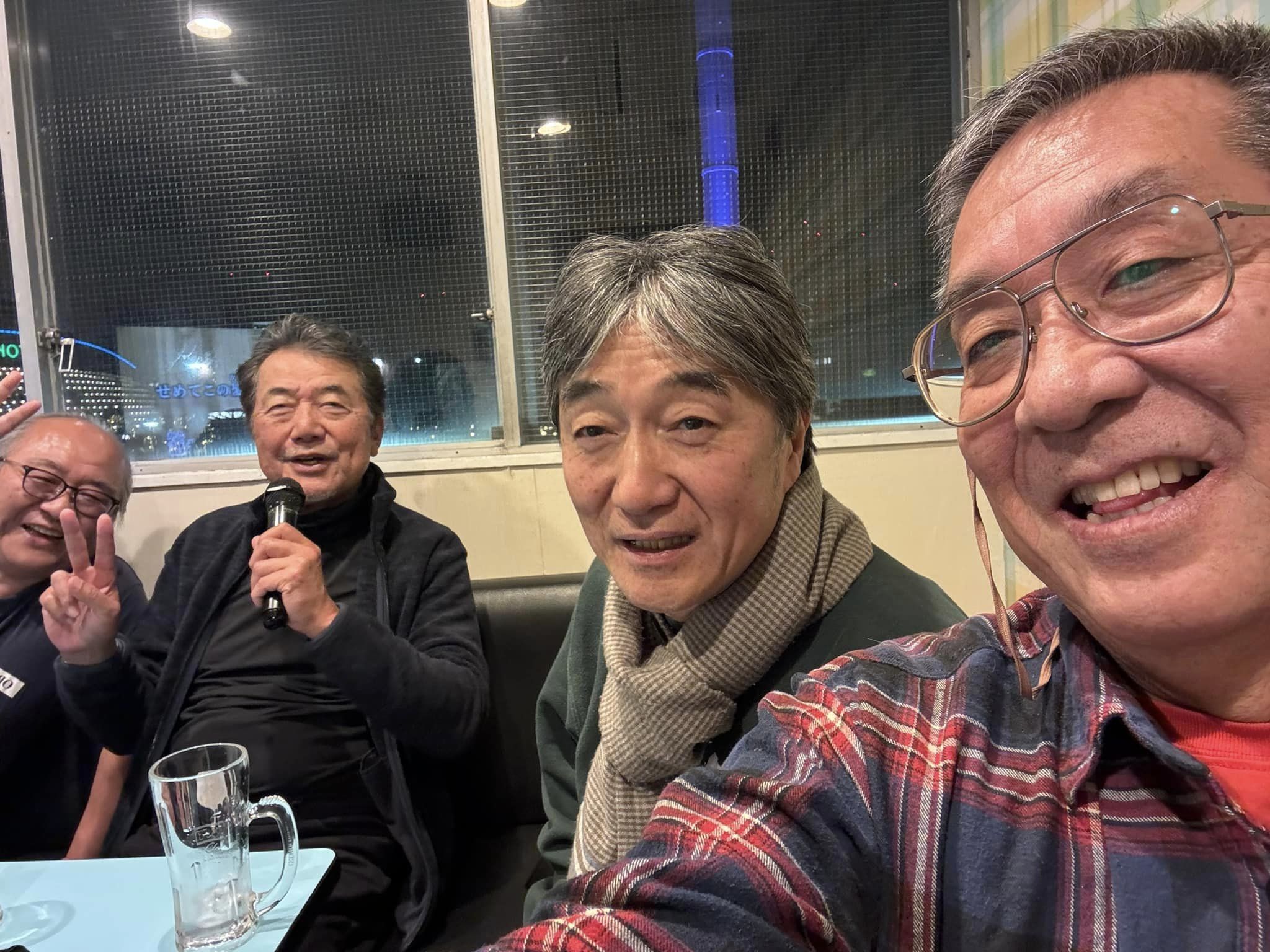 | カラオケの部屋に入ると、東京ドーム周辺の明かりが綺麗。 | でもオヤジ4人でワイワイ。 | 映画の会もこの4人になっちゃった。安田も亡くなった。 | 12月初め、国沢さんの忘年会でクルマ好き仲間と、夢の島マリーナで。国沢さんは難病の手術後。 |