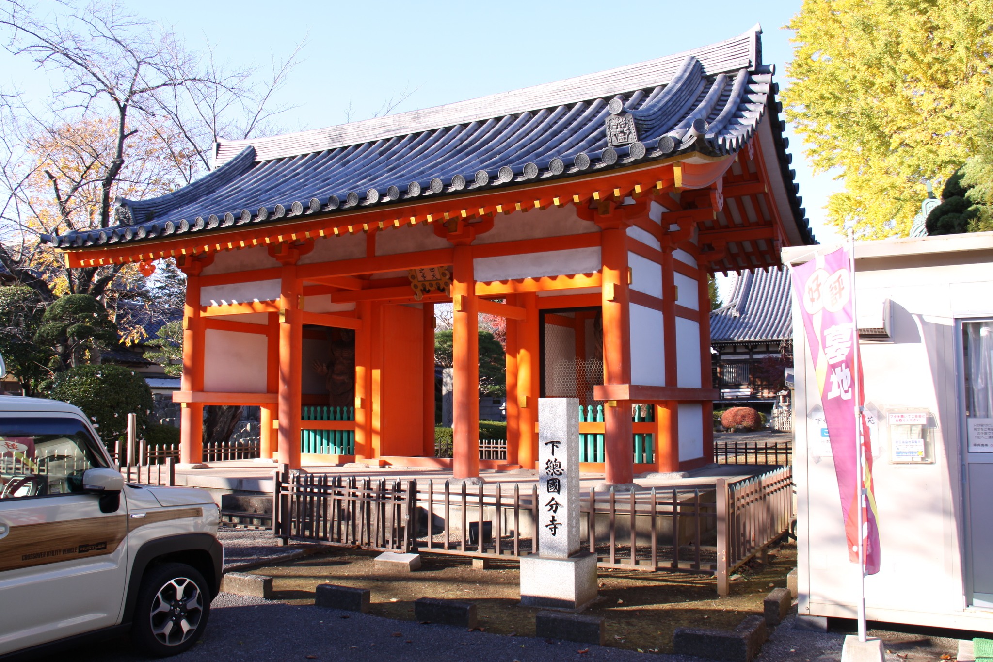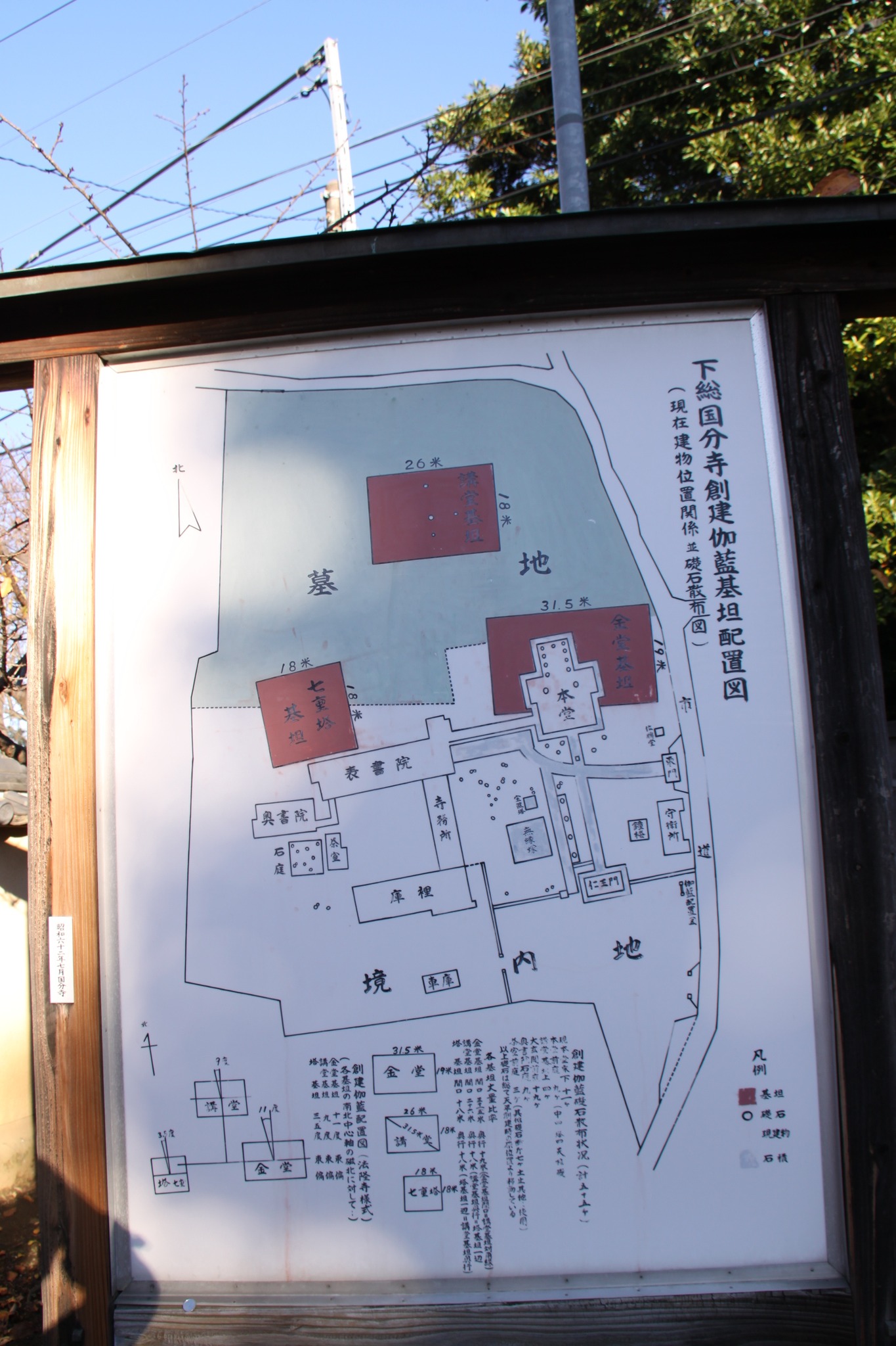 | - | 曽谷貝塚跡。広い芝生になっていて、正面の坂を下り、登って行くと国分寺跡。 | 今の国分寺の仁王門前で。 | かつての国分寺には、講堂、金堂、七重塔があったとは。 | - |