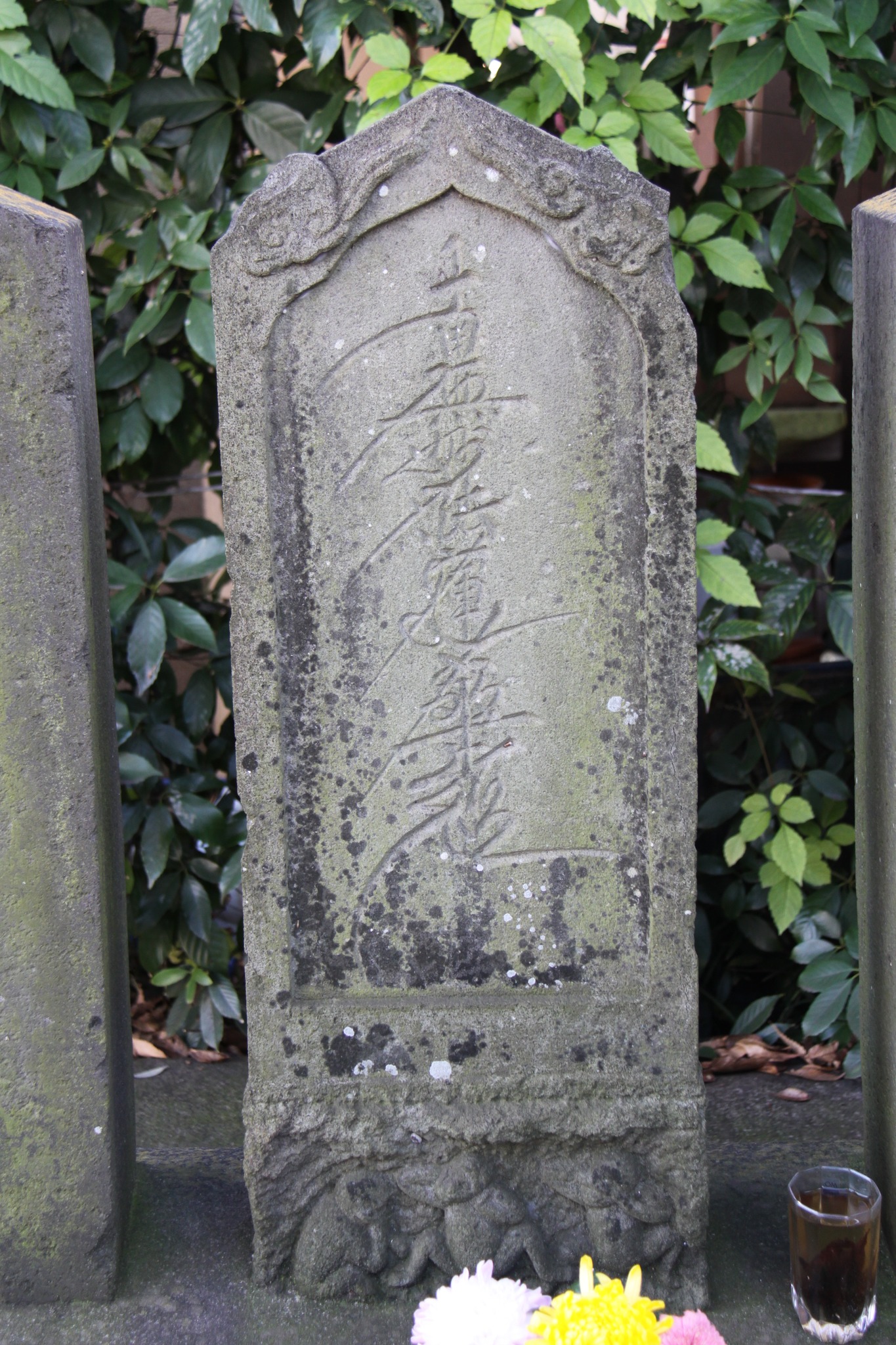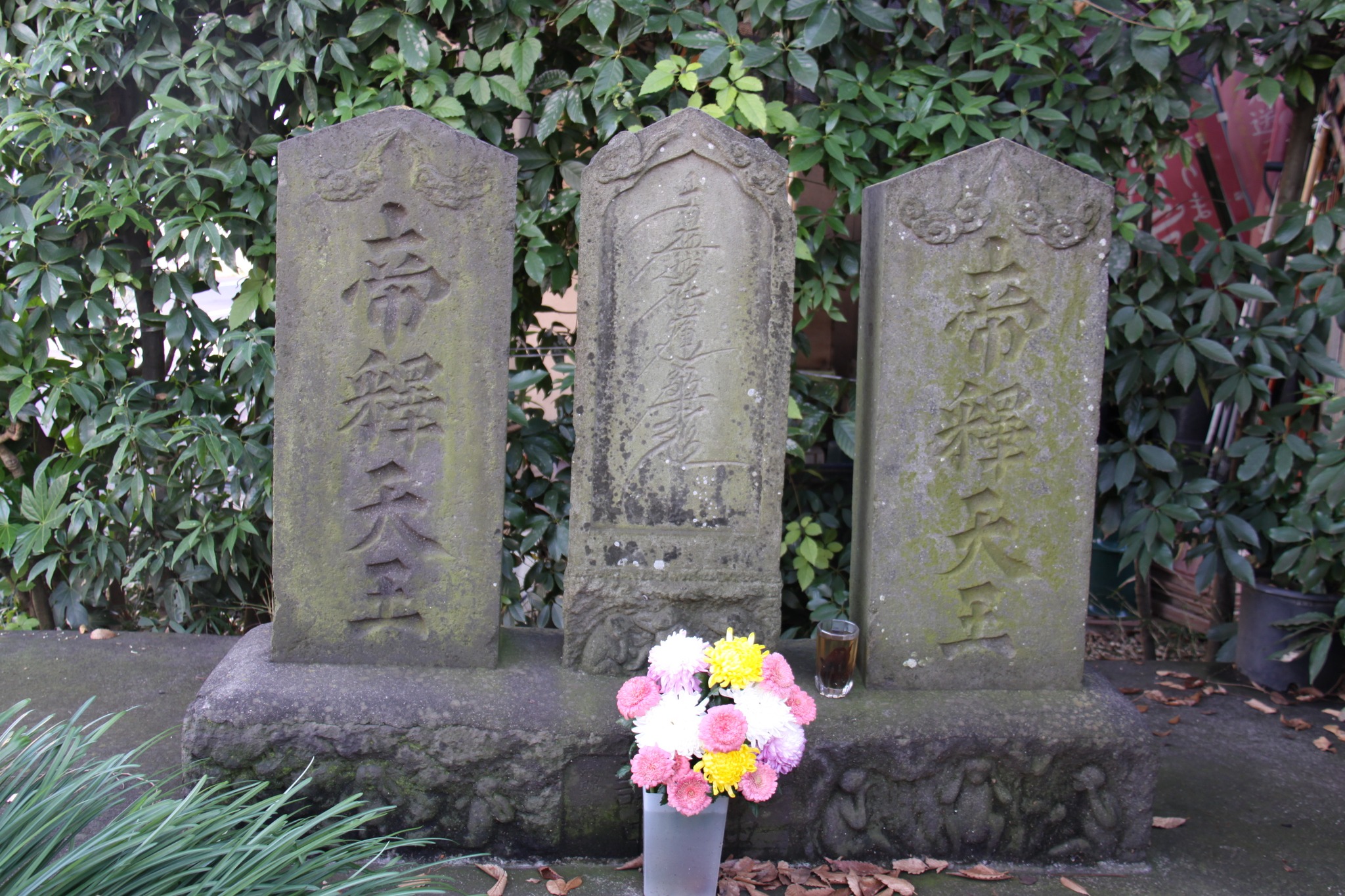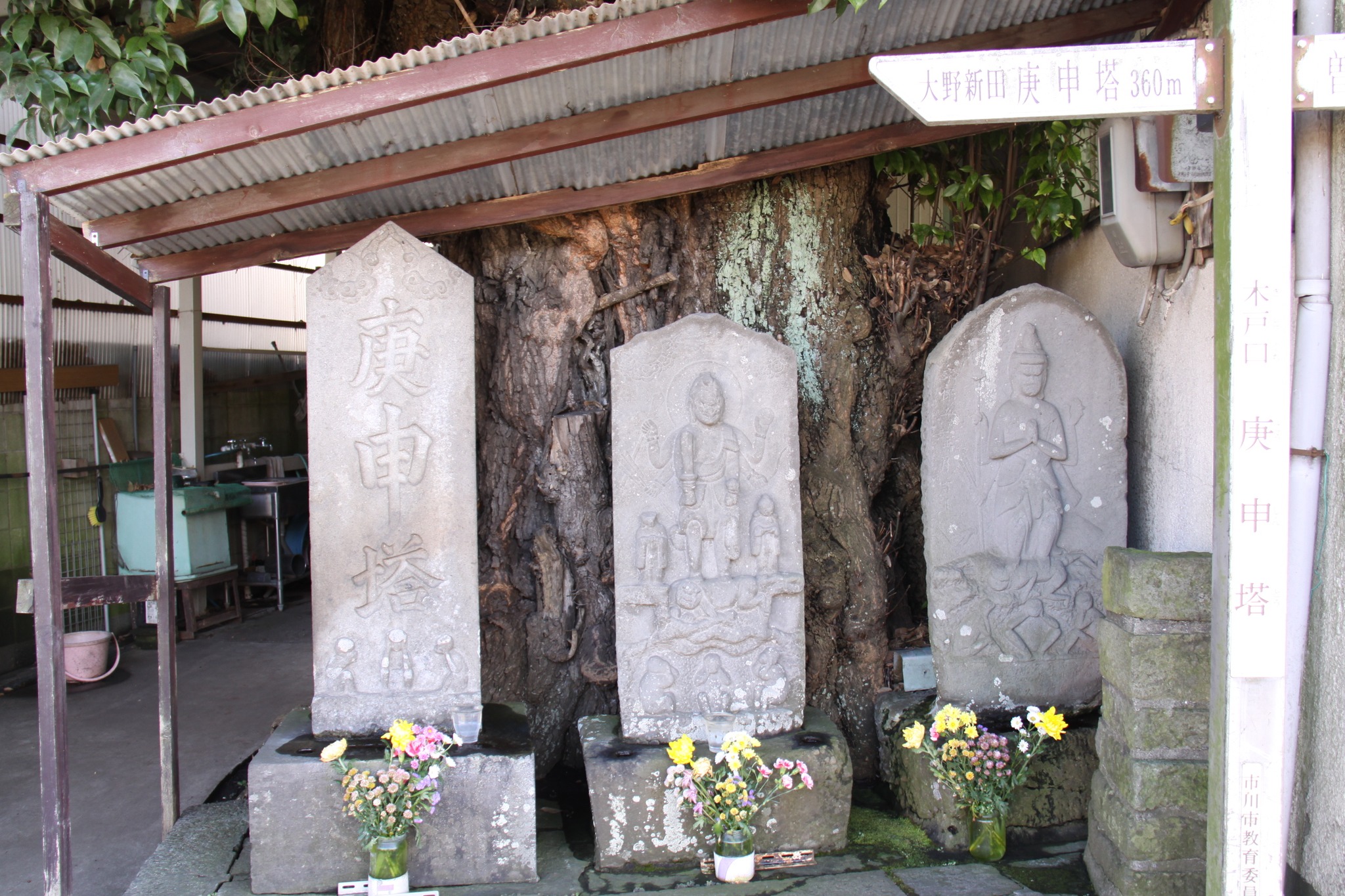 | いつもは車で通り過ぎていた。道祖神では無く庚甲塔だった。木戸口庚申塔。 | 花が供えられていた。青面金剛、邪鬼、三猿、揃ってるなあ。 | - | 大野新田庚甲塔。 | 読めない。 |