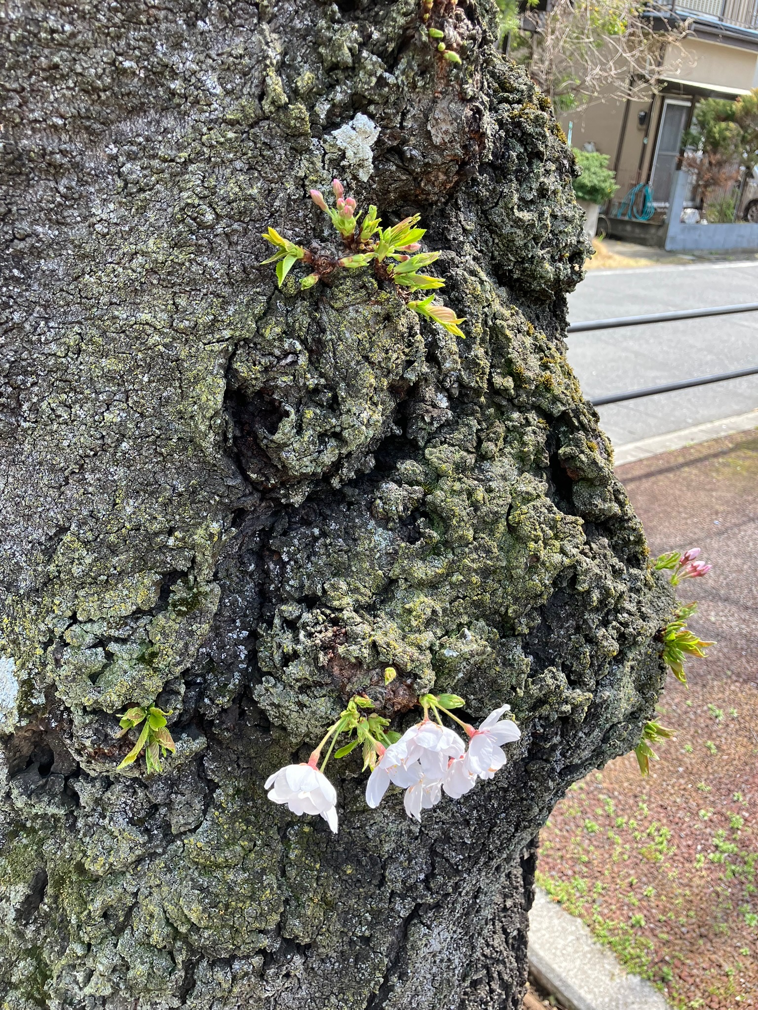 | 近所の桜並木。45年以上の老木から直接花が。染井吉野の寿命は70年程というけど、苔生し捻じ曲がってえらく古びて来た。 | まだ三分咲きだったのに、今週の寒さと雨でまだ咲かないねえ。この近くに家を建ててはや41年。子供達は一人前になり、孫も授かったから良かったかな。この道を10年近く、子供達を保育園に送って行った。 | 1970年8月頃かなあ。日付が分からない。 | チリ館のおねいさんと同僚と。 |
