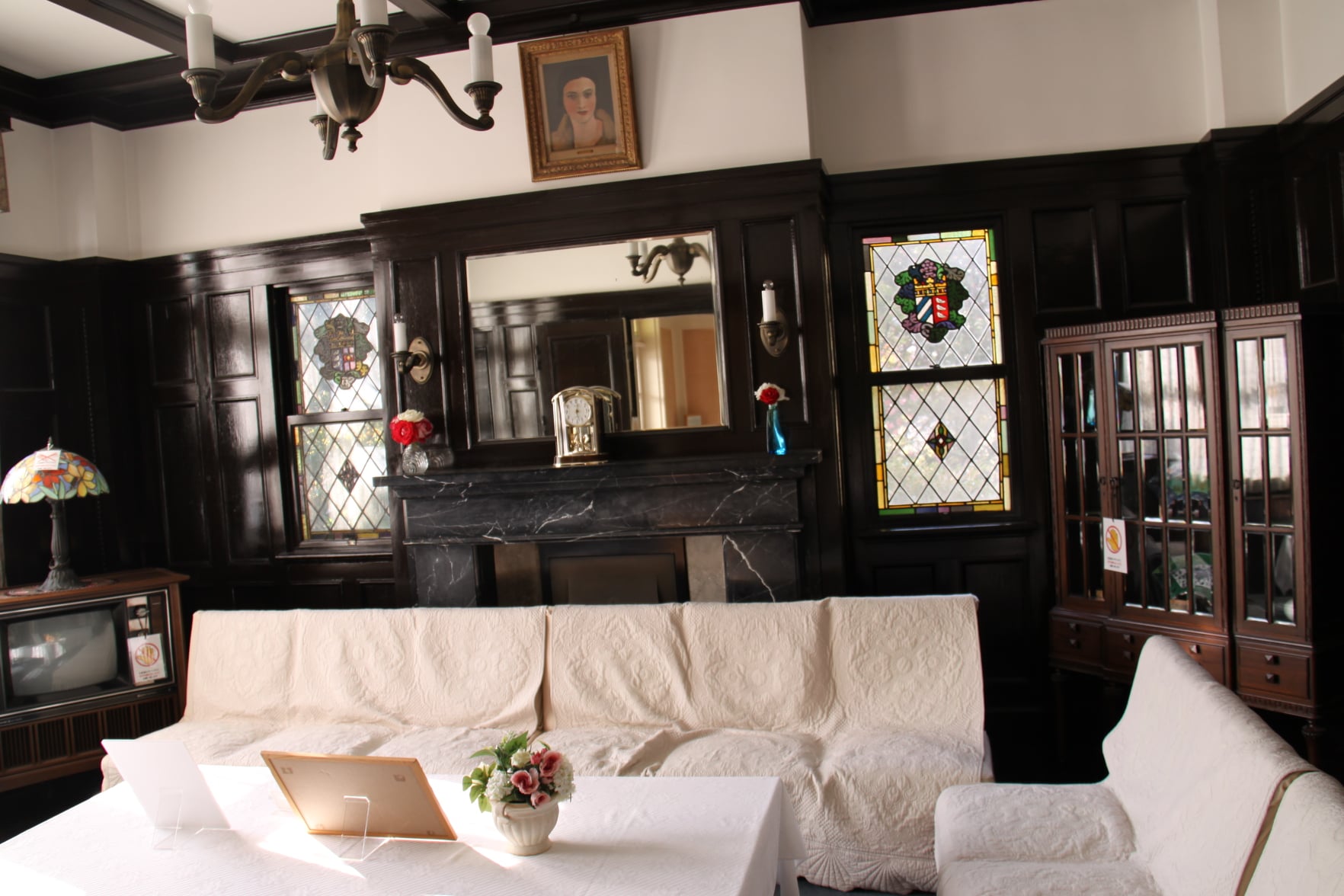 | ステンドグラスは著名な小川三知の作品だそうだが、ピンと来ない。 | - | 二階は、元は三つの寝室だったが大広間に改築。 | - | - |