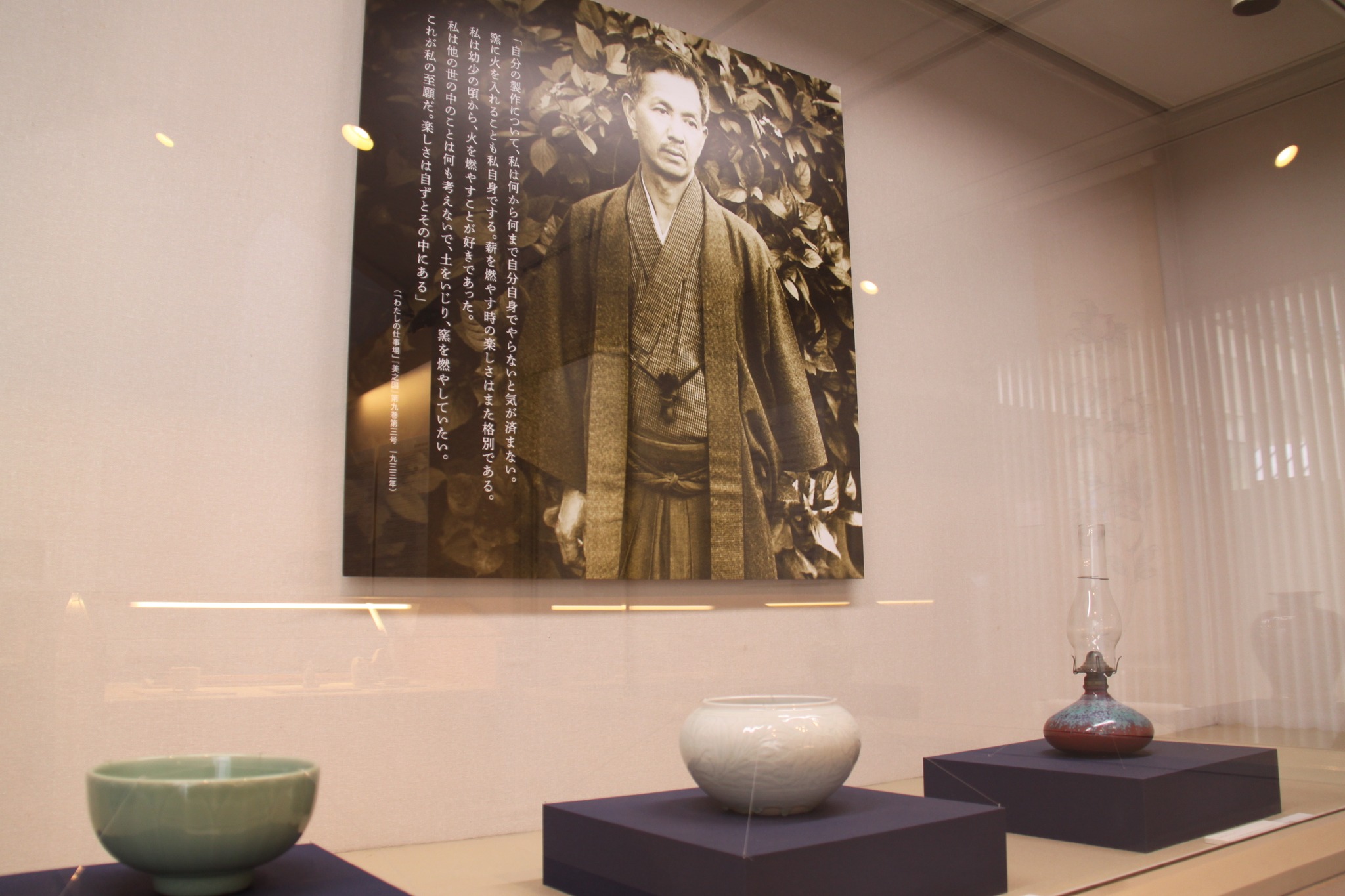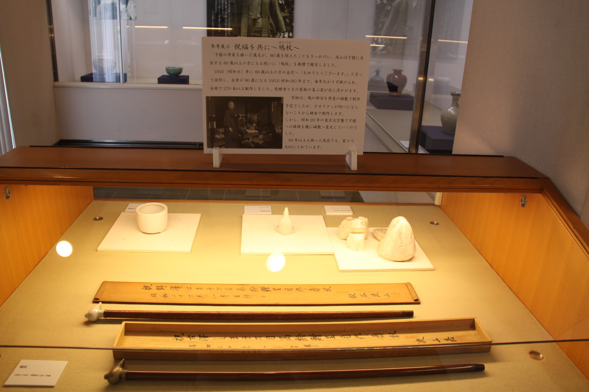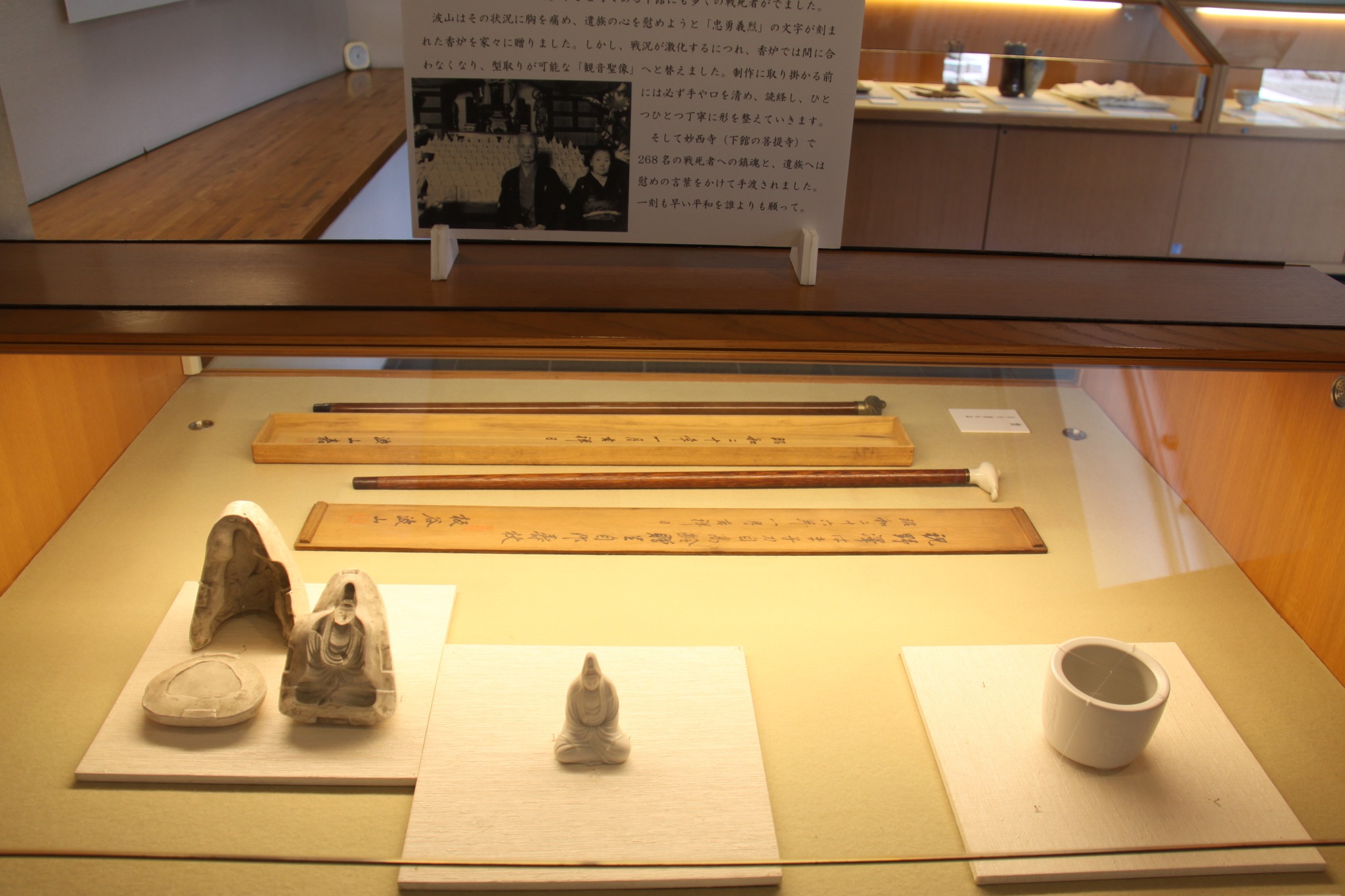 | 80歳以上の方々に、自前で杖を造り贈呈したそうだ。 | 80過ぎても頑張って作陶しているが、顔立ちが良い。こういう顔に私もなりたい。 | この青磁が私は好きです。 | 戦死者の遺族に香炉や観音像を贈呈したそうだ。 | 狭い展示室だが、人もいないし、じっくり拝見出来る。 |