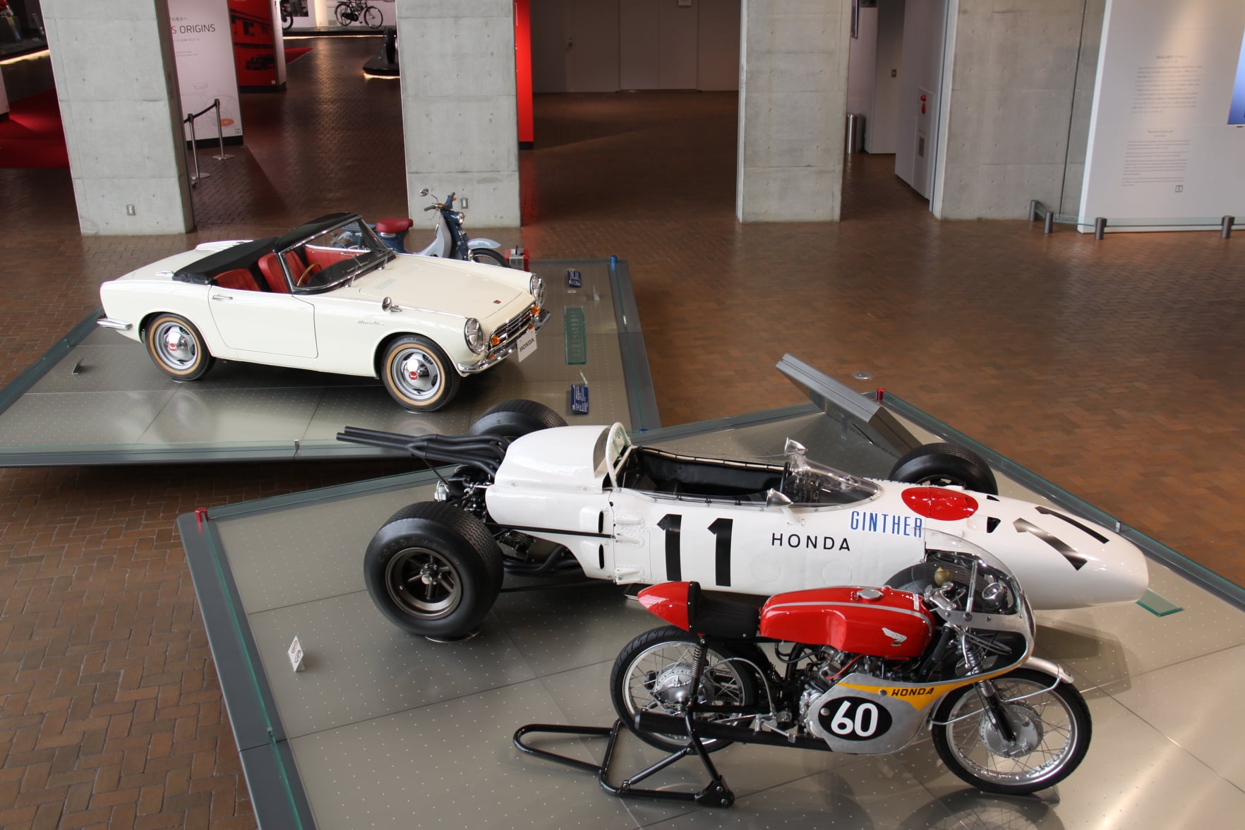 | F1車両の展示が見もの。 | 本田宗一郎が若い頃に乗ってレースをやっていたカーチス。 | 正面ホールにはエポックメイキングなホンダの4車種。 | S600とカブ。 | 二輪レーサーとF1。 |