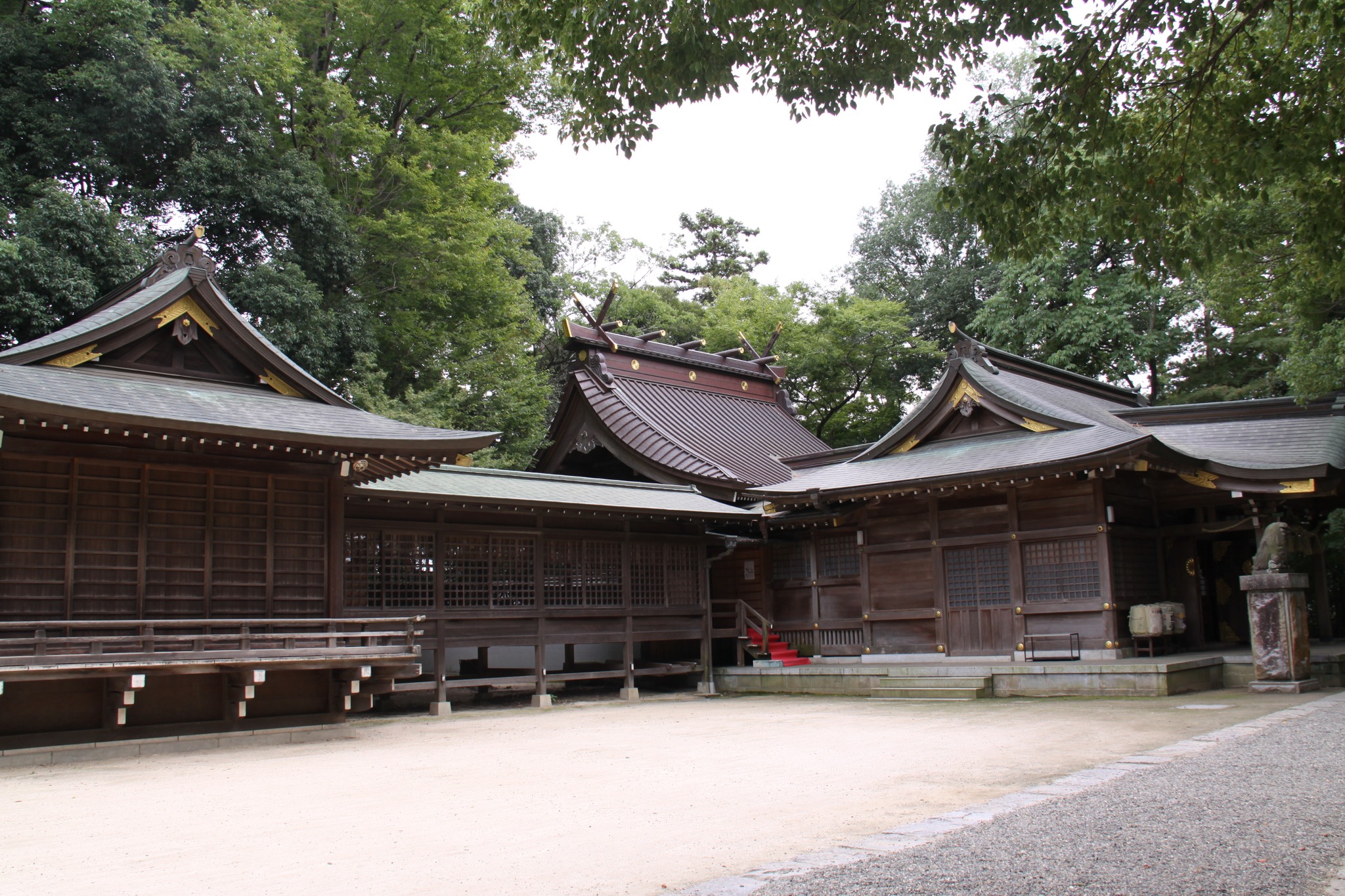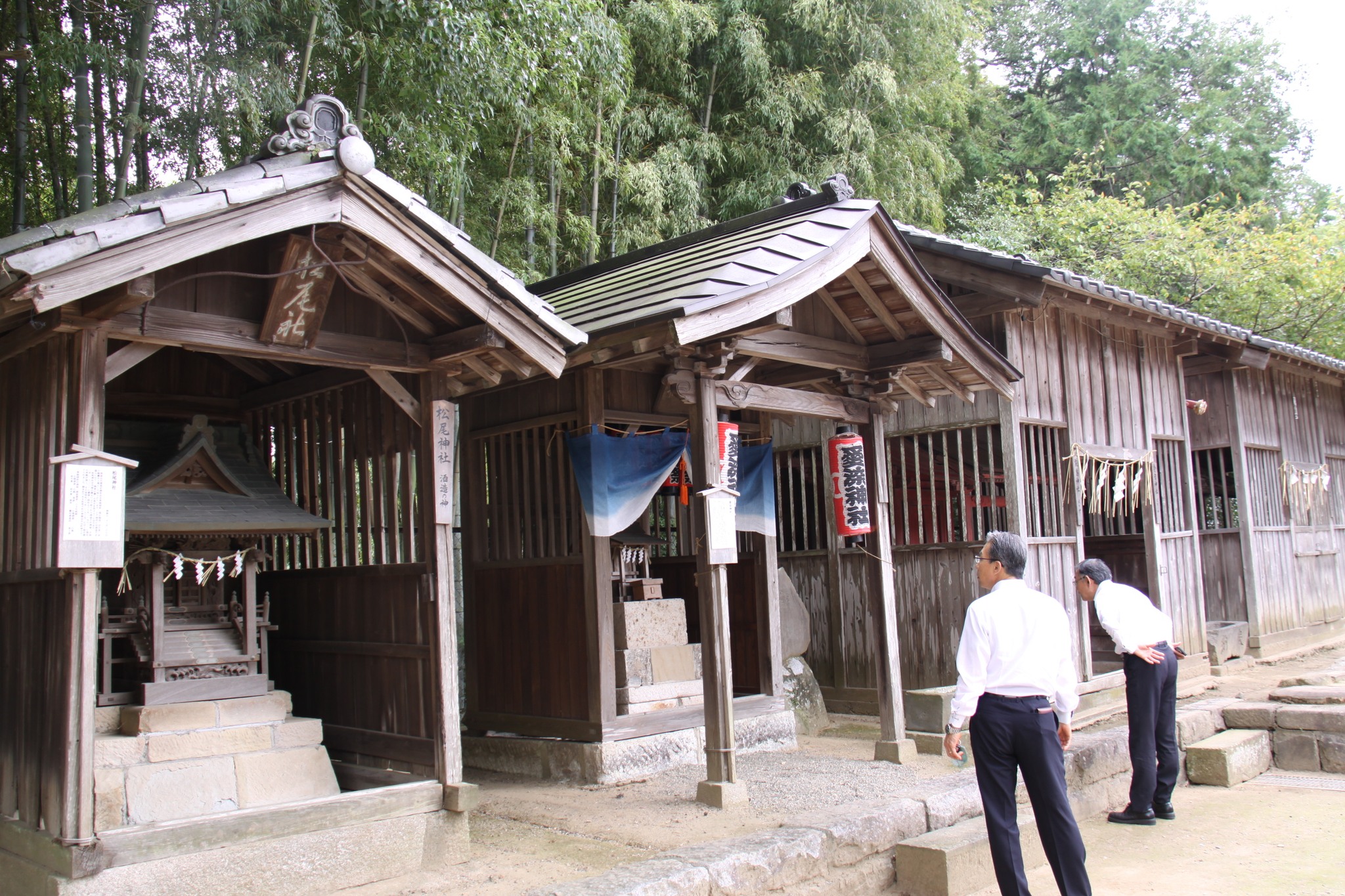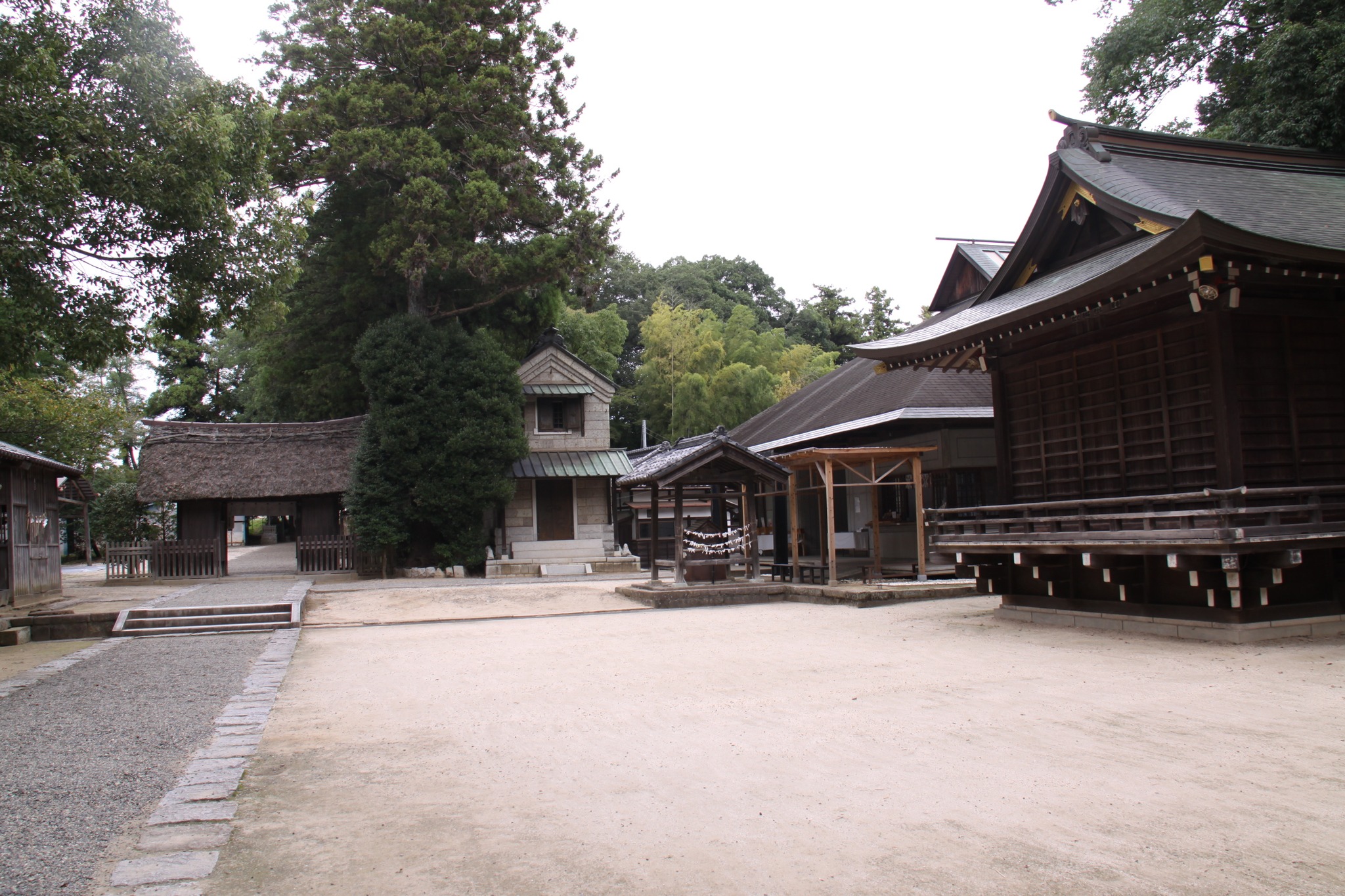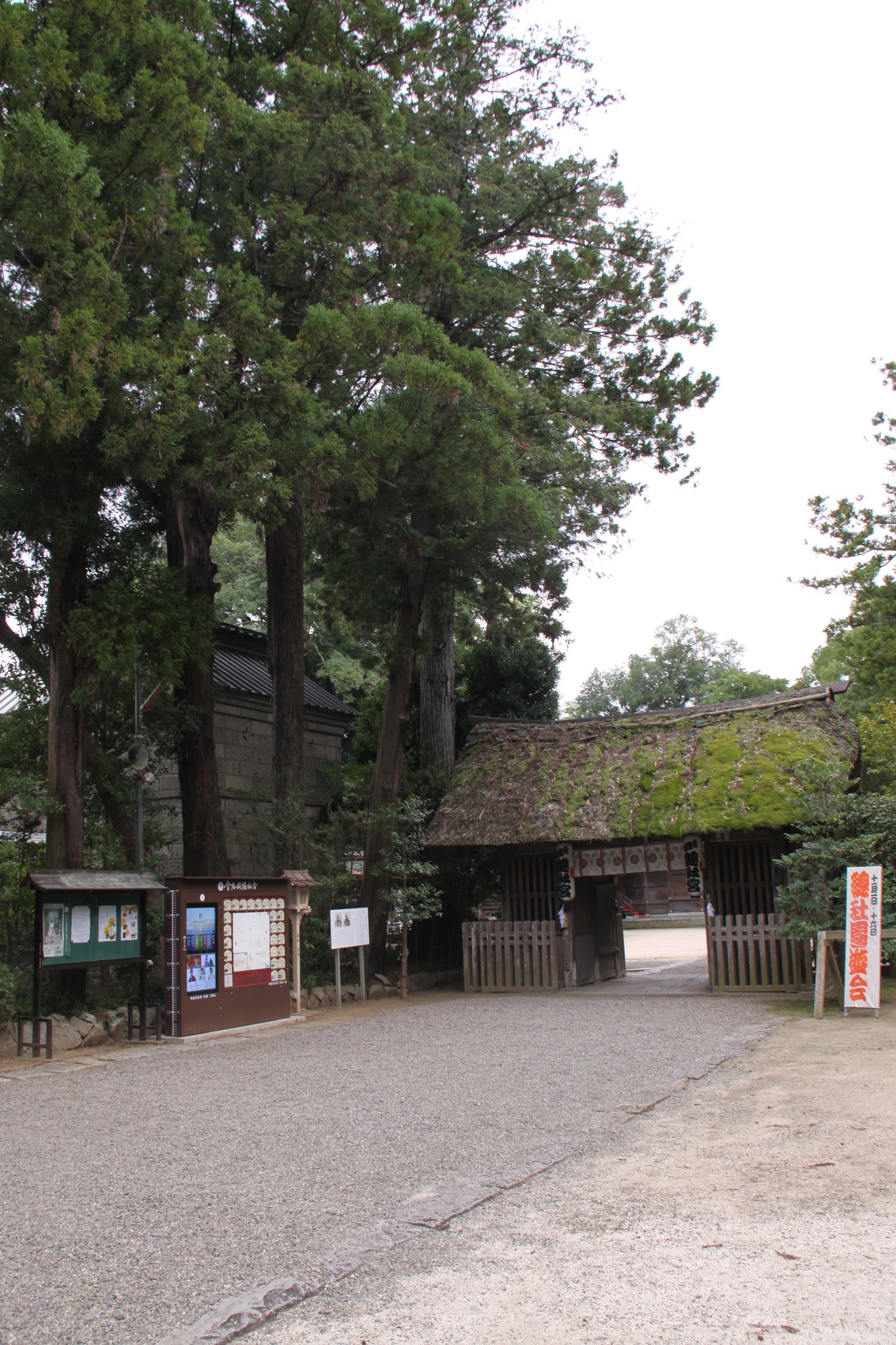 | 藁葺きの随神門。 | 拝殿もご立派。 | 随神門まで、裏から。 | 御神楽もやりそうだ。 | 松尾神社、愛染神社など。 |