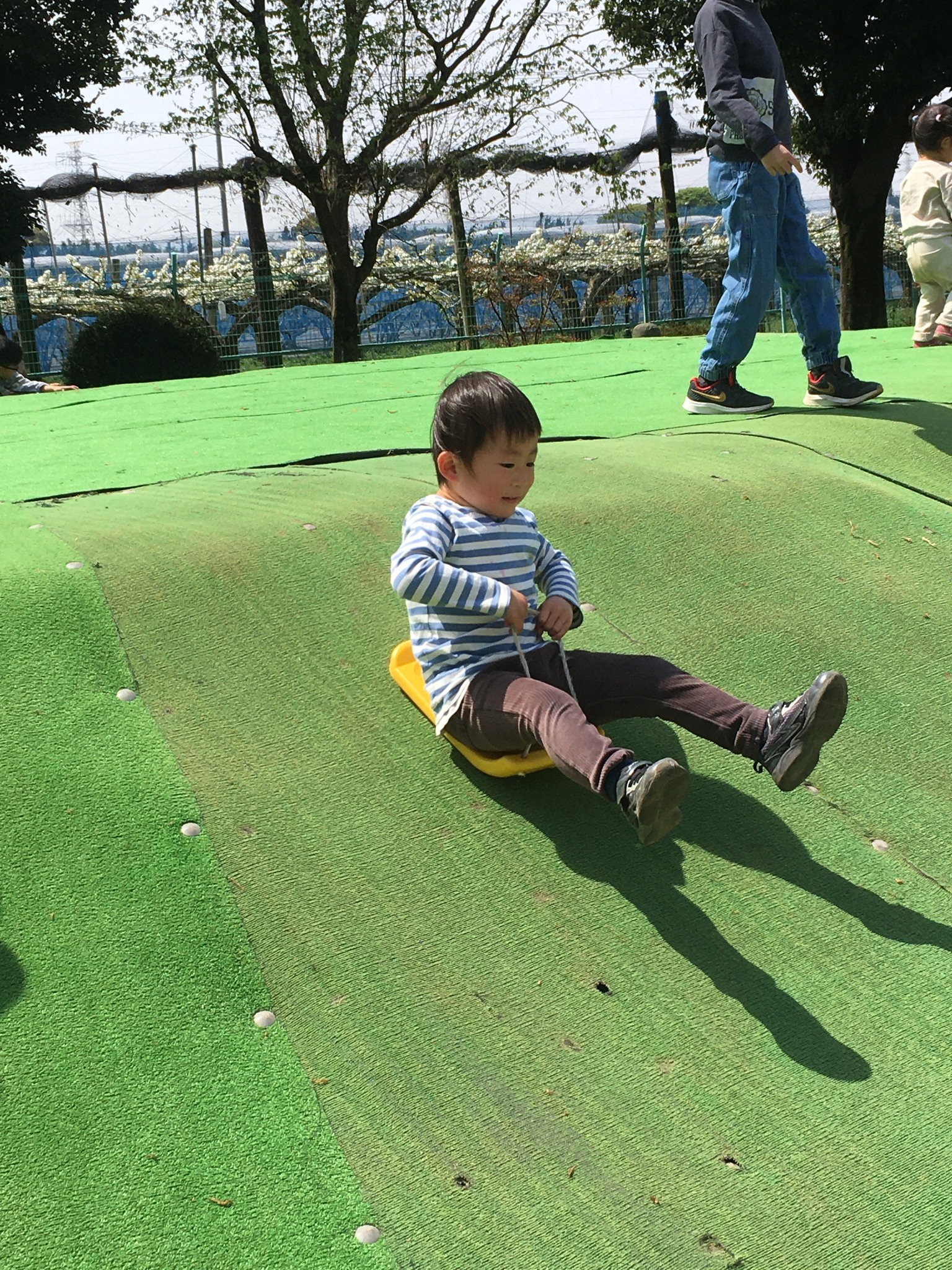 | 孫1号2号と女房と長女。平和な風景だ。 | 孫3号、初めてのイチゴ狩り。しっかり食べていた。 | 昔からあるミニ鉄道。三回乗りました。 | ソリ山、これは楽しそう。孫2号は結構やんちゃです | 梨の花。これから実がなって、ジューシィな市川梨ができるんだなあ。 |