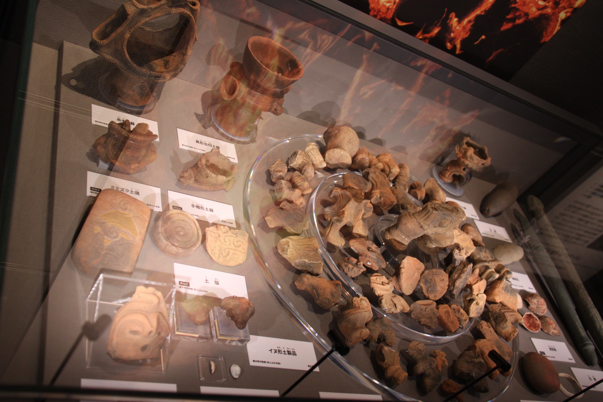 常設展。縄文から順を追って。 | オーソドックスな展示というか、全て揃った文化というか。 | 土偶のコーナー。 | 人面付き土器。これは見たことなかった。 |