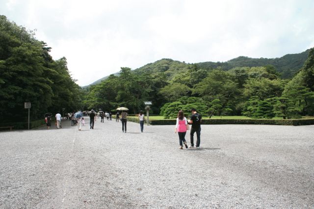 | 五十鈴川御手洗場。禊をする、川を越えるというのが日本古来のやり方。 | 拝殿まで。 | この奥の御正宮を撮れないのが残念。唯一神明造で、金色の千木四本、鰹木10本が美しい。 | 式年遷宮御敷地。 | 風日祈宮橋。 |
