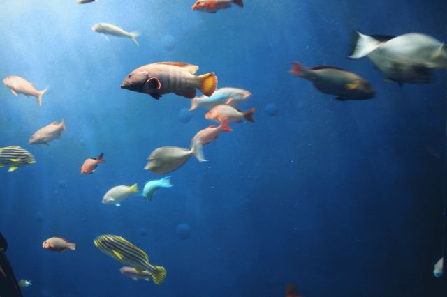 | - | 海から見たアクアマリンふくしま。 | 金魚の水槽も沢山有り、珍しい。 | 翌日、いわき明星大学。インドネシア・シーラカンスの本物が展示されていた。 | ホルマリン漬け。 |