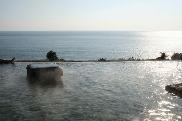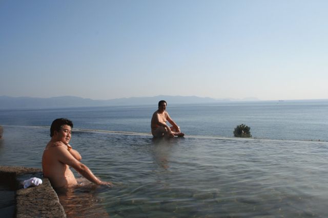 | 吹き出してます。 | 右が露天風呂。本当に人はチラホラ。 | 開聞岳を望むヘルシーランド露天風呂。 | 絶景です。目の前は東シナ海。 |