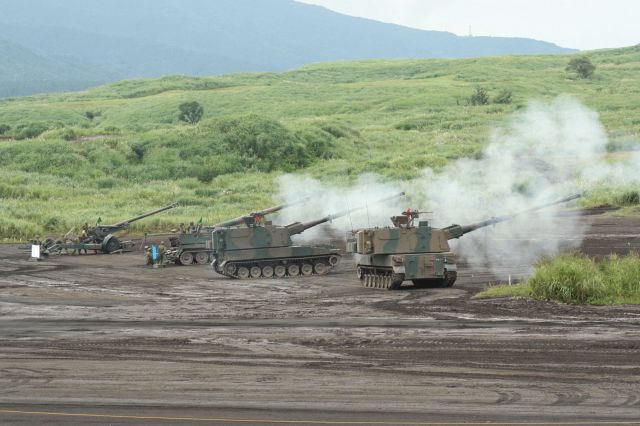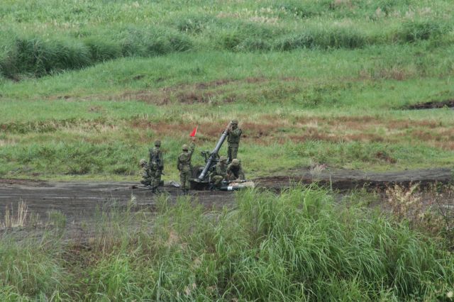 | 203mm自走りゅう弾砲、登場。 | 99式自走155mmりゅう弾砲。 | 特科火力、勢揃い。左端は155mmりゅう弾砲。 | 撃て、とアナウンスしてました。 | 155mmりゅう弾砲。 |