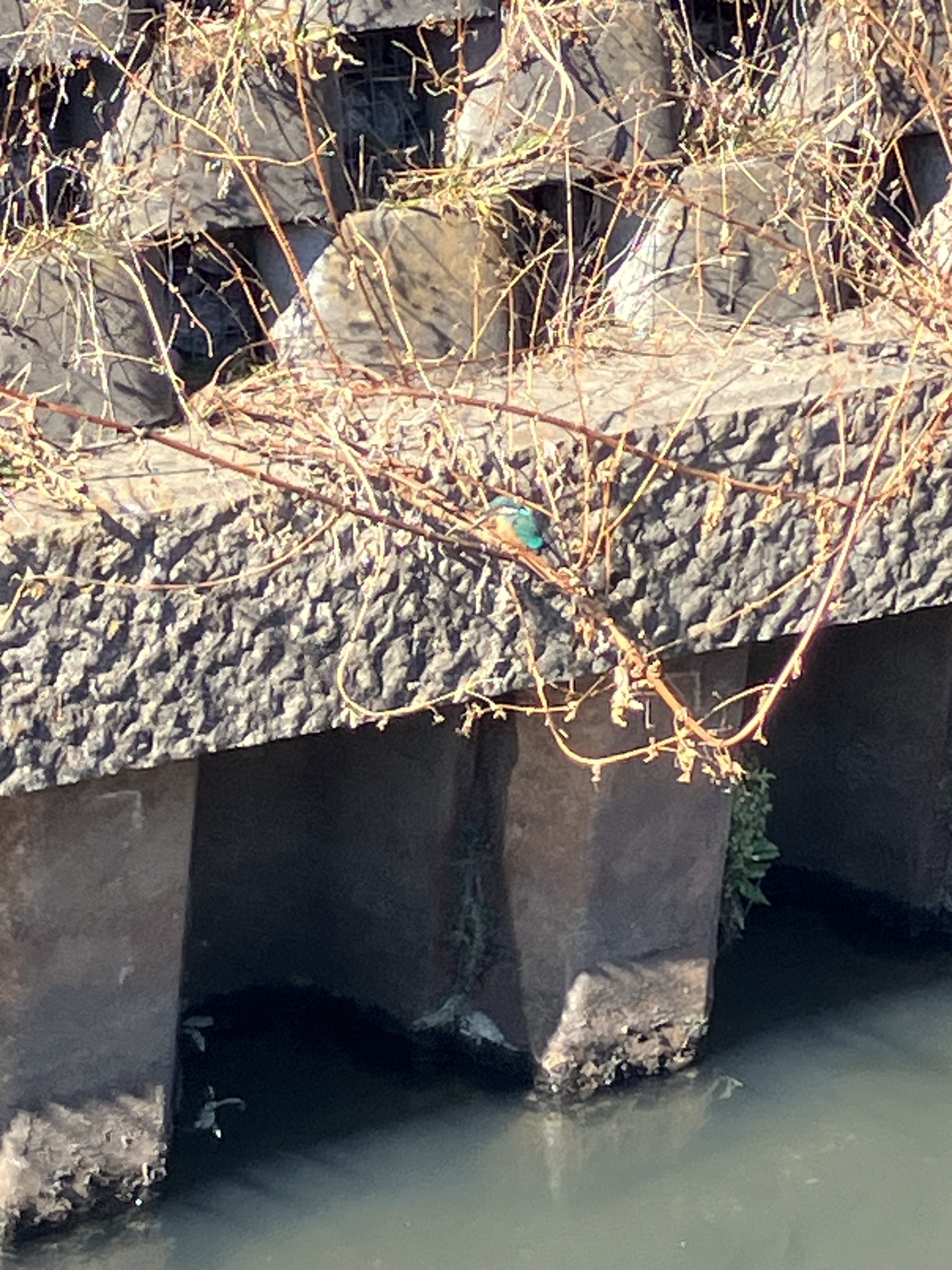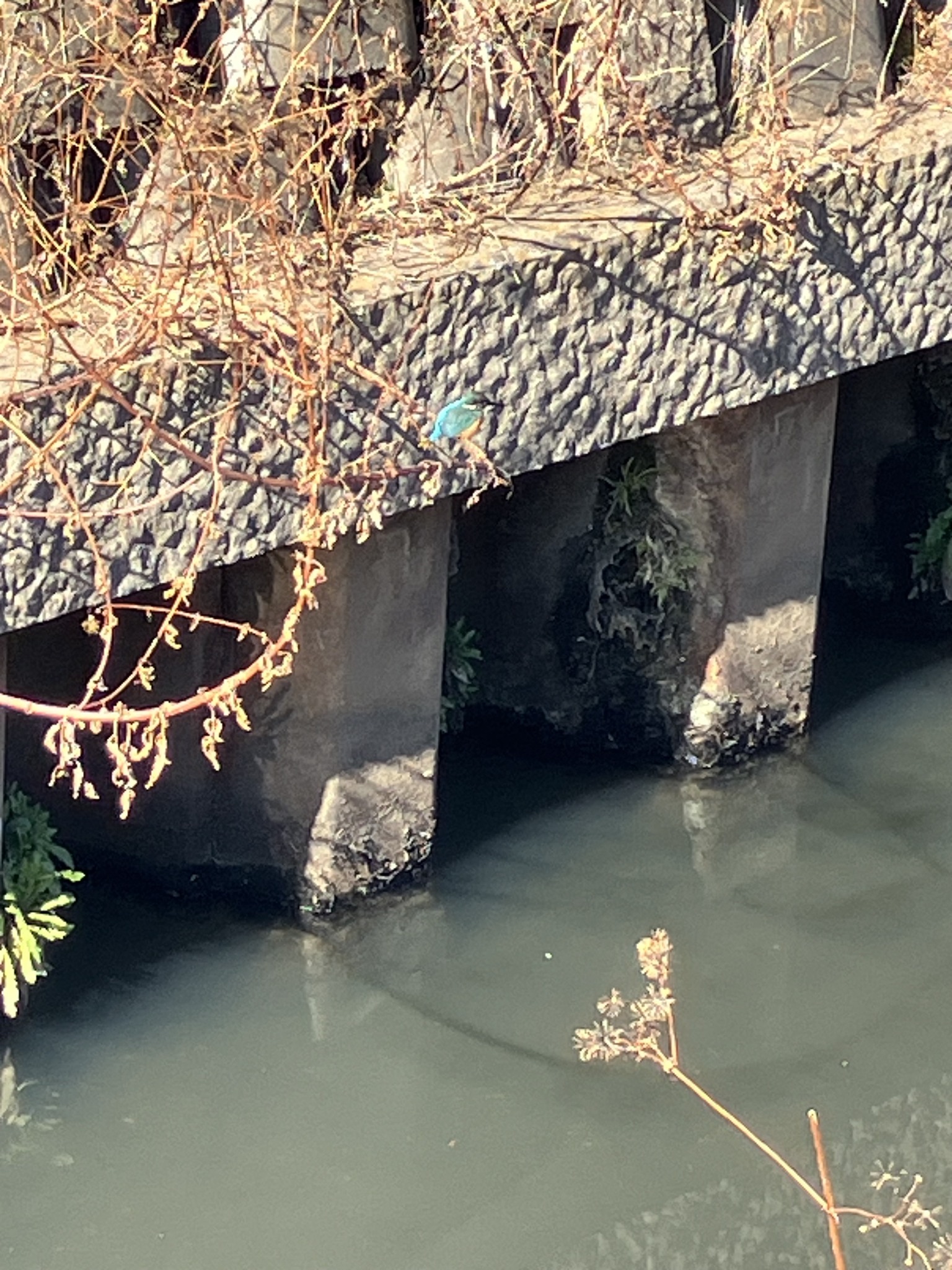 | これ、間違い無くカワセミだね。下嘴が黒いから雄。雌は下嘴が黄色いそうだから。 | いやあ綺麗だねえ。 | ここ10日ほど、この辺りにアオサギくんが居たのだけれど。 |