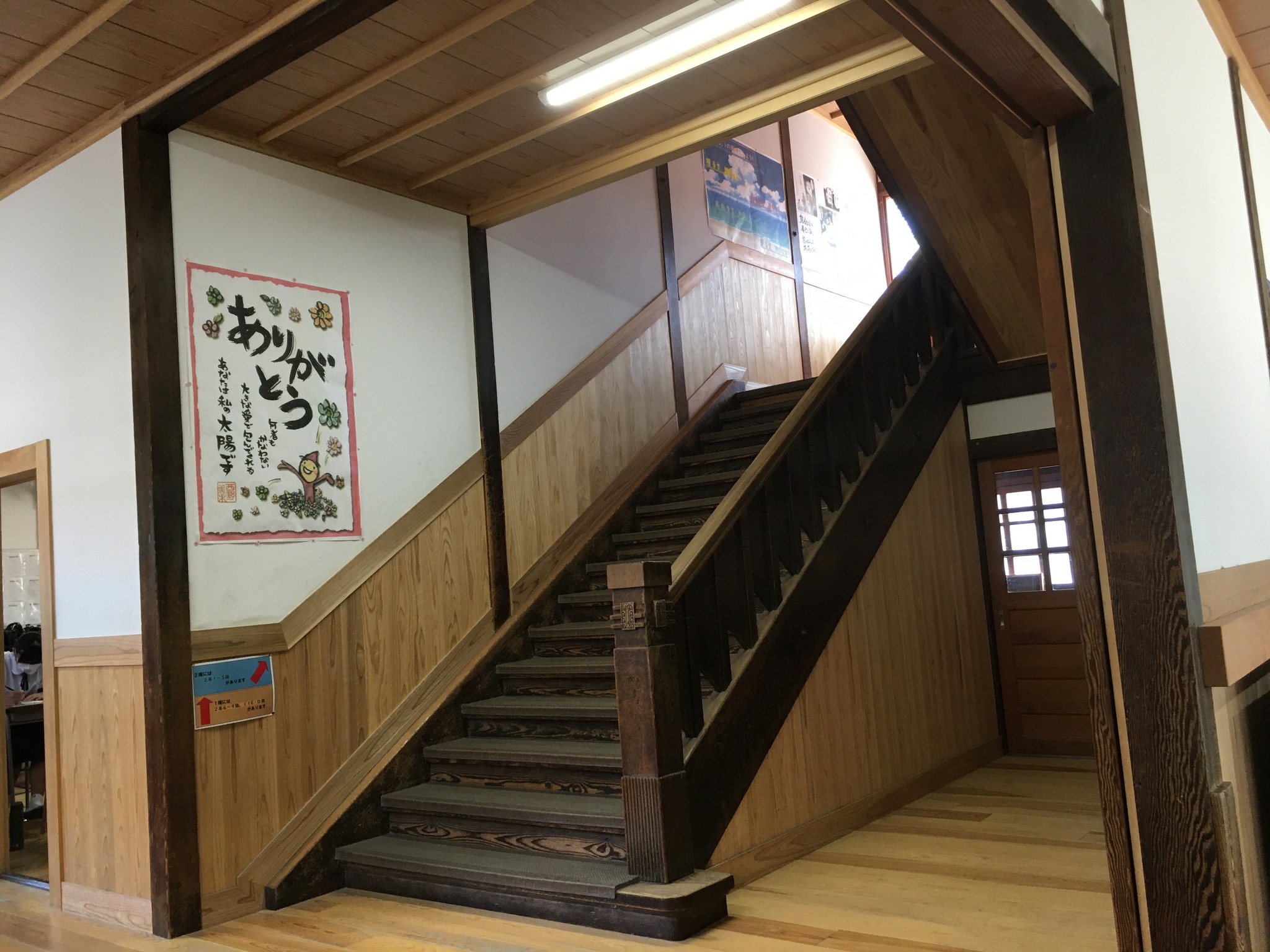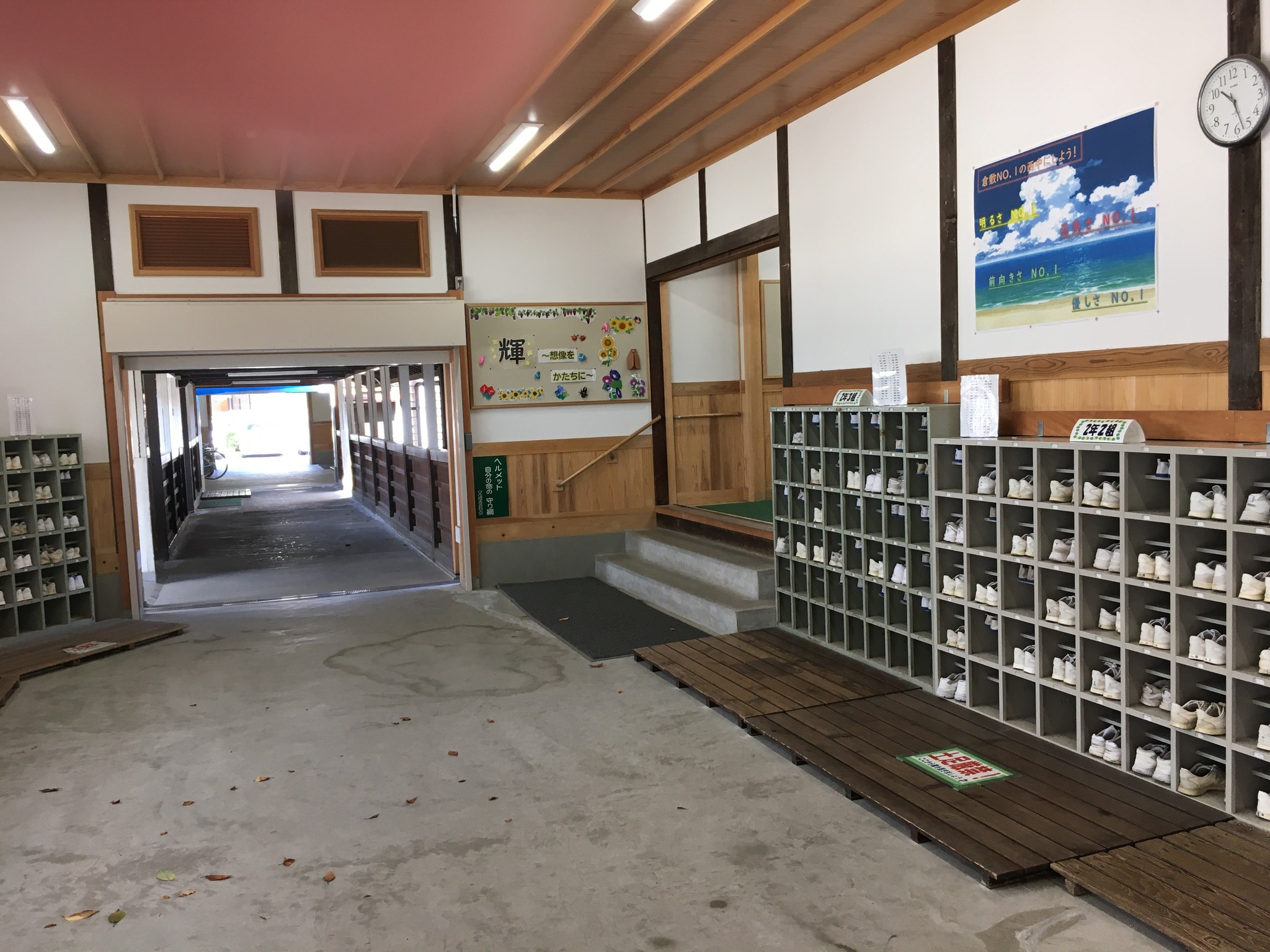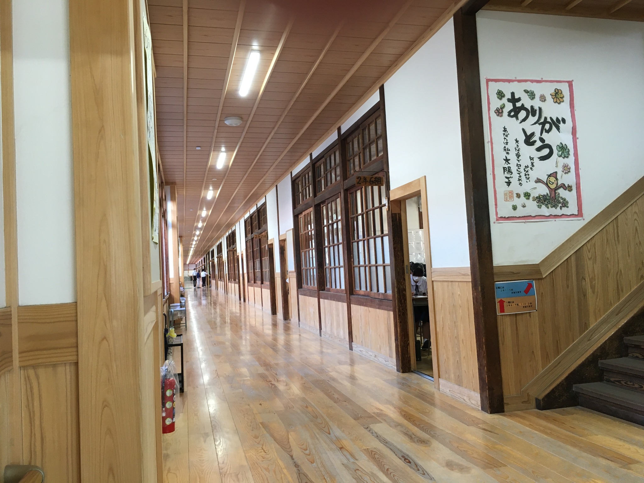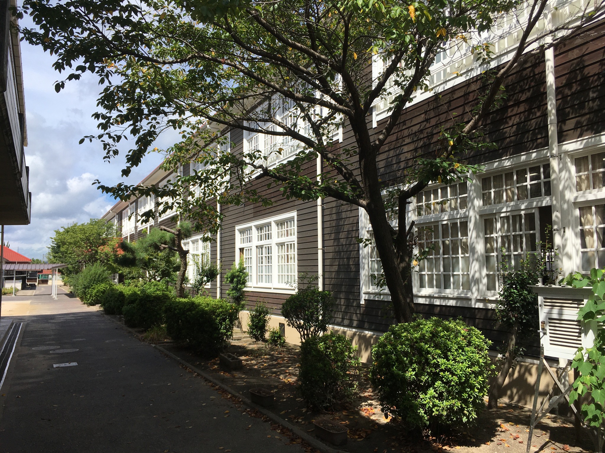 倉敷その四、木造校舎。 午後の新幹線には時間があるので、母校、倉敷市立西中学校に歩いて行ってみた。道が新しくなっていて少し迷ったが、着いたら懐かしい。でも15年前に来た時よりも、屋根も壁板も綺麗になっていた。行き合った人に聞くと、数年前に耐震補強、板の張り替えなどリニューアルしたそうだ。 彼は「僕は昨年赴任したんですけど、良いですねえ」と、若い教員だった。 築75年ほど。当時生徒が掃除、水拭き、油引きなどやっていた。皆んなでやるのでそれほど嫌ではなかったが、時々疎かにすると誰かが注意していた。良いなあ、この雰囲気。リニューアルすれば保つのなら、木造が良いねえ。