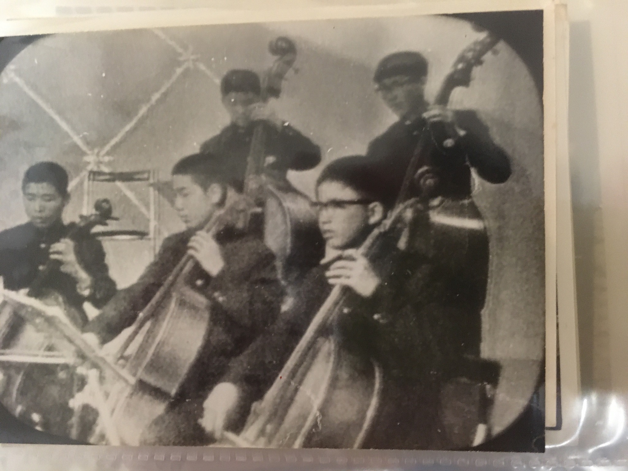 | 下駄箱も昔のまま。 | 階段下が部室だった。 | 新しい、綺麗。 | テニスコート、軟式だったな。隣の中学からワルたちが木刀とチェーンを持って押し掛けたのはここだった。 左側にプールと音楽室があった。 | 器楽合奏部にも入っていて、コントラバスをやっていた。これは山陽放送に出演していた時。親父がブラウン管の我が子を撮ってくれたのだが、写りが悪い。 |
