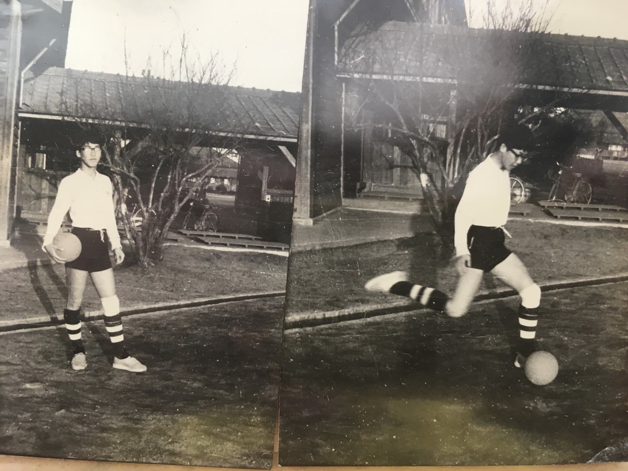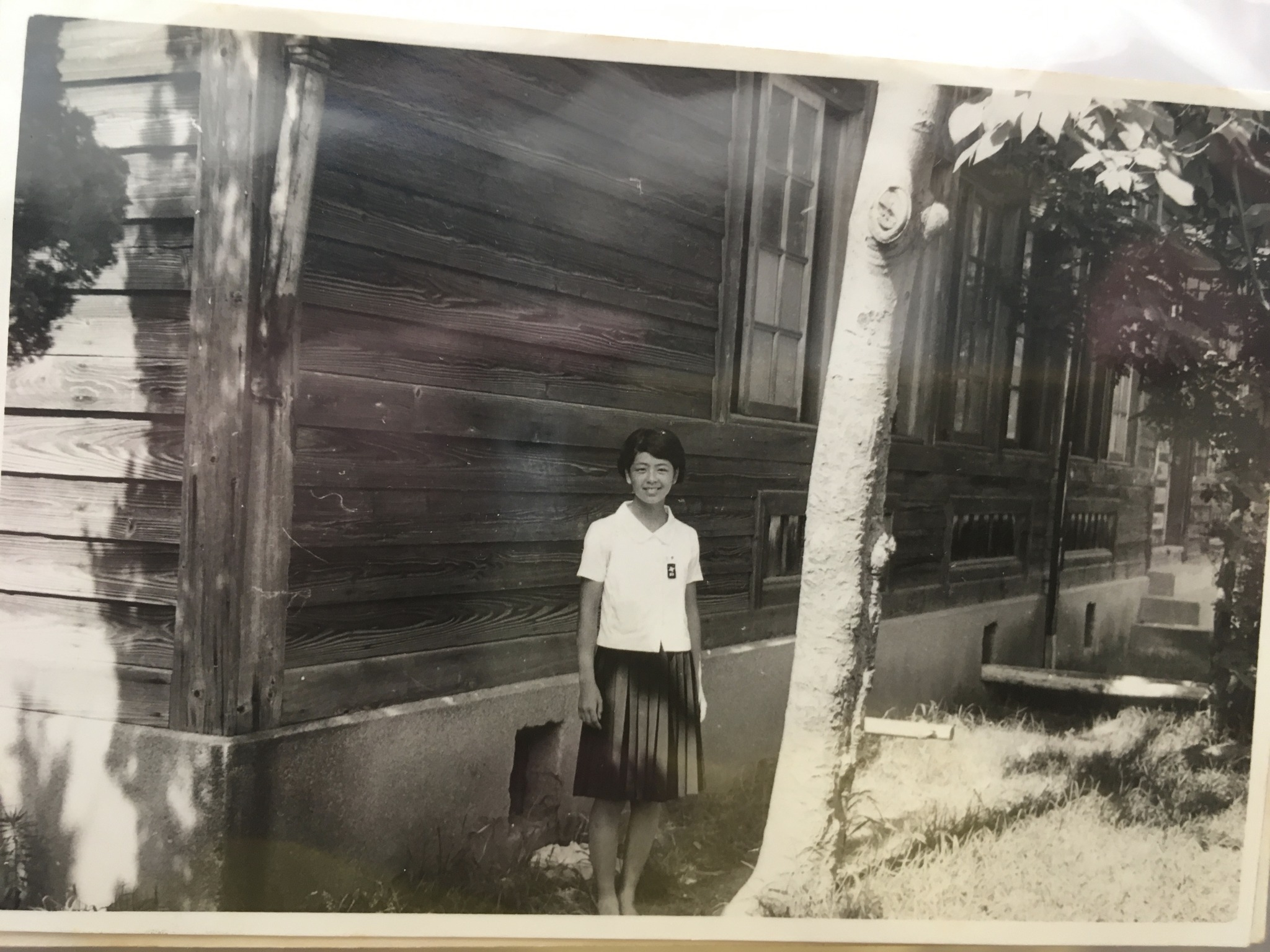 | 中庭。 | 一年下の彼女と写真交換した。可愛かったなあ。中庭で撮ったのかな。文通したり、立ち話する程度。一度グループで海へ行ったが、手も握らなかったなあ。 | 自転車置き場。ここの腰板は昔のままか。 |