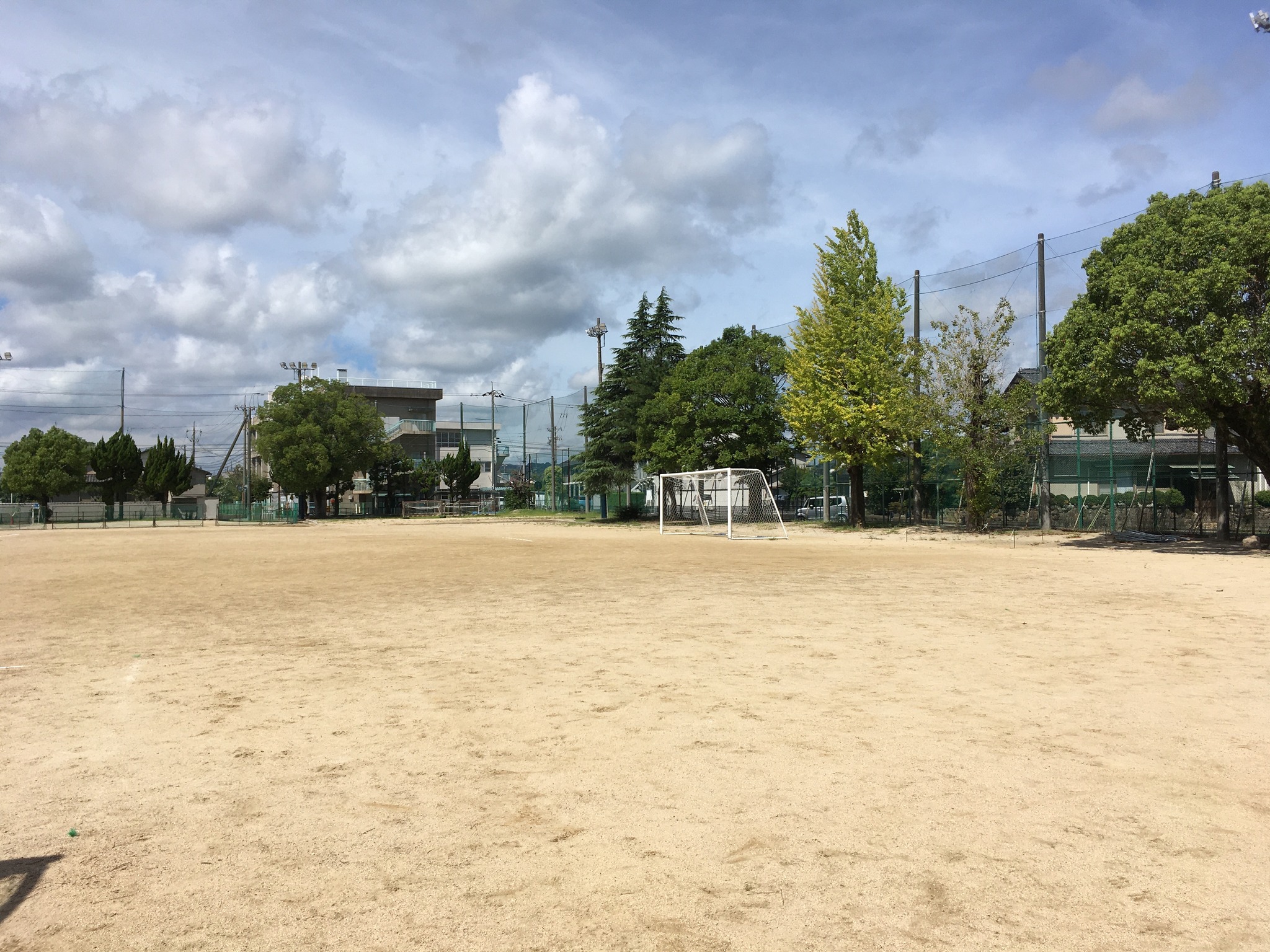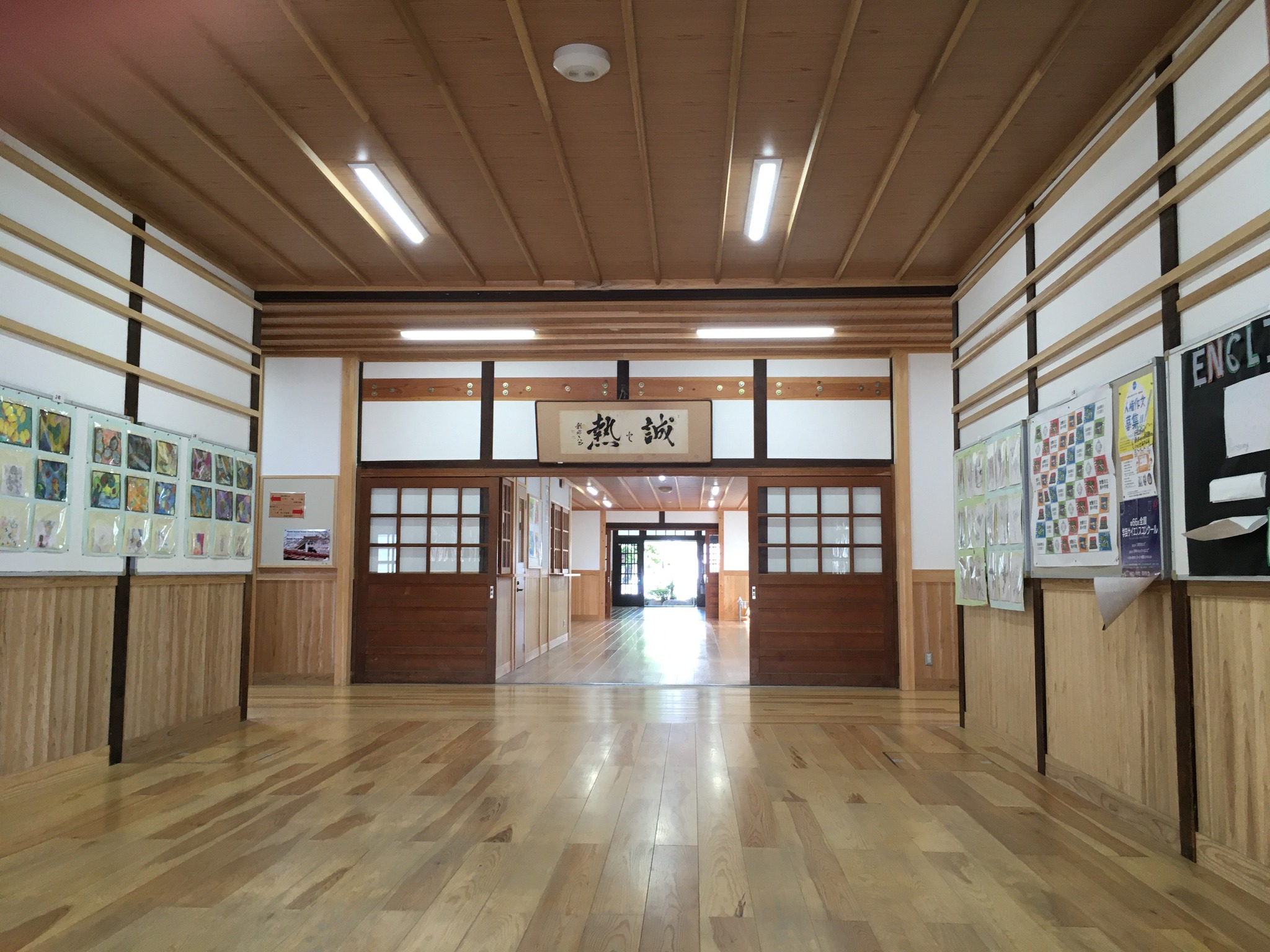 | ここだねえ。左側に雑貨店があって、サッカーの練習後に牛乳とアンパン食っていた。 | 何だか15年前よりも綺麗になっていた。聞いたら改修しているそうだった。でも雰囲気は昔のまま。 | 中央廊下。床板も綺麗になっていた。左奥が売店で、パンを買っていた。今も売店だそうだ。 | 確かに壁板も窓枠も綺麗で新しくなっていた。 | グラウンド。野球部とソフトボール部とサッカー部が共用。広さも昔のままだ。 |