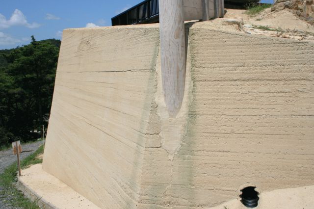 | やっと西門へ帰還。暑かった、疲れた、足が痛い。 | 確かに山城の意味が分かるような眺めです。 | 角楼の土塁は、土を少しづつ入れてつき固めた版築土塁です。 |