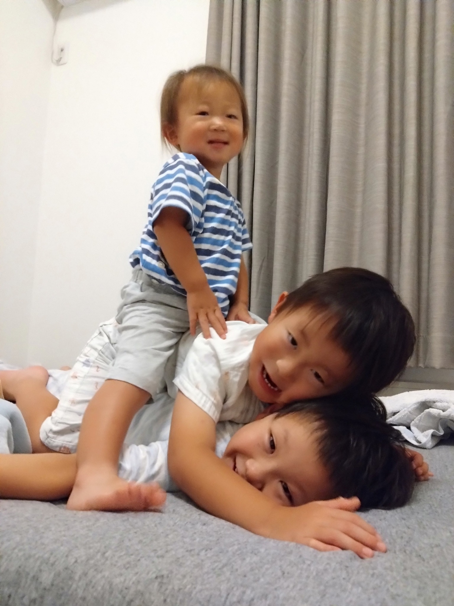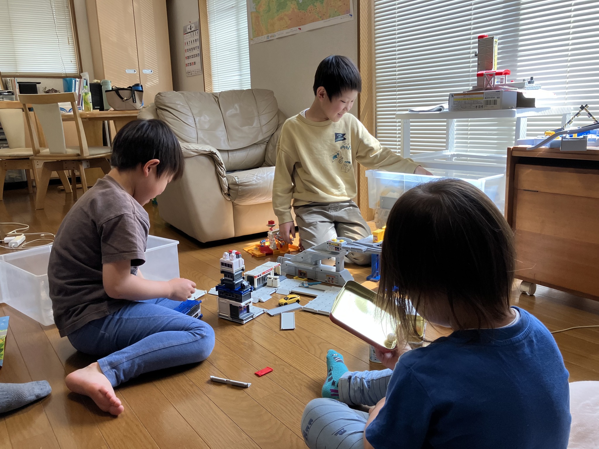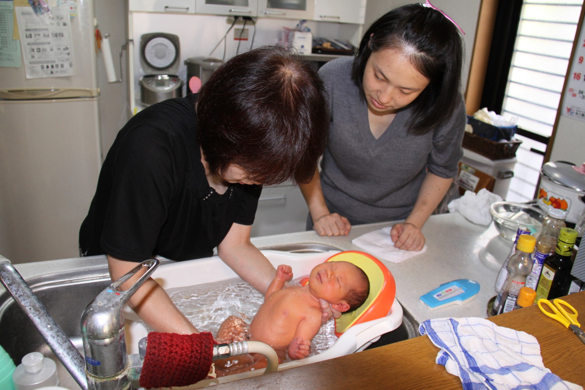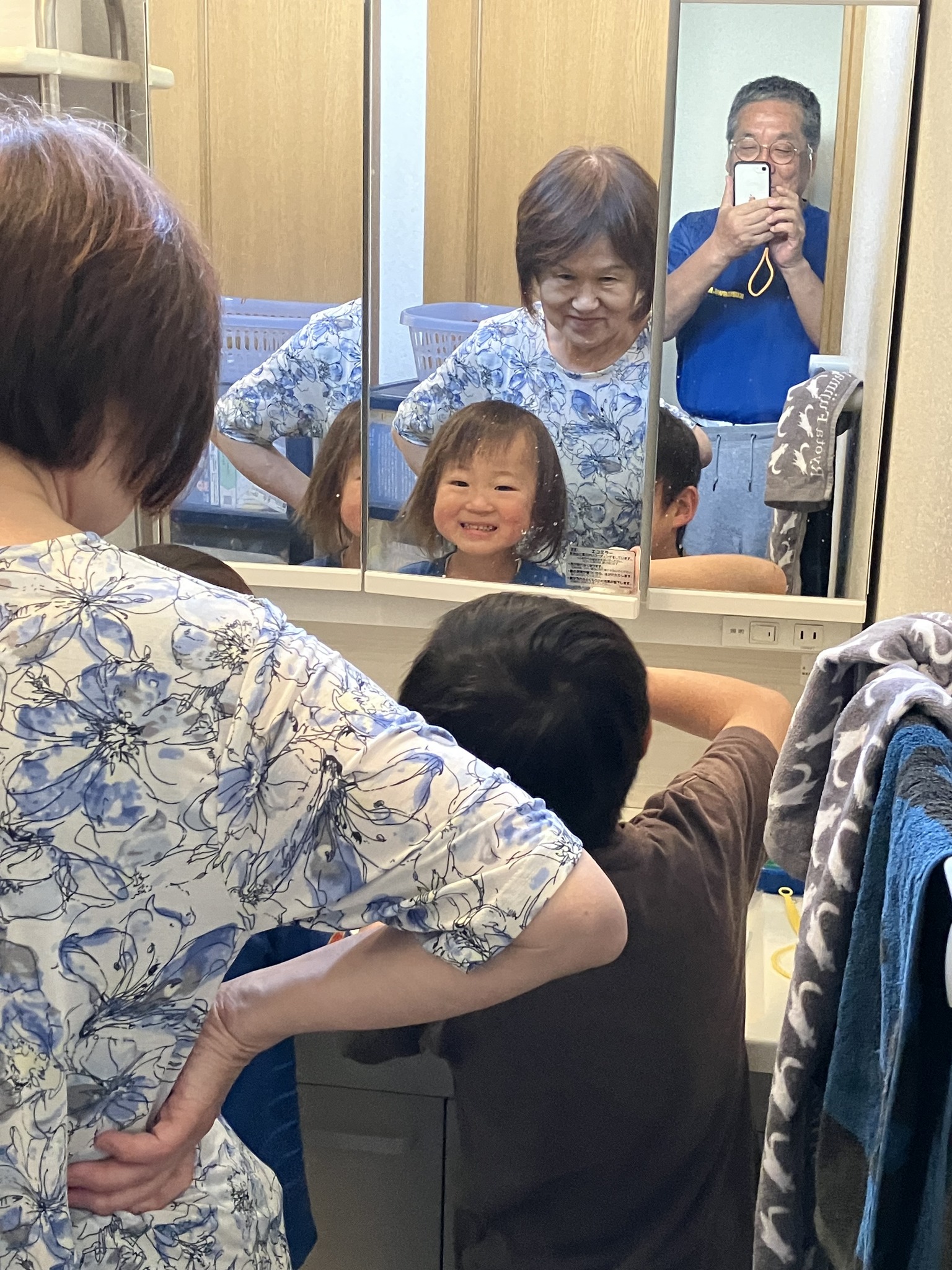 | 女房に鰻重と熱燗でお祝いしてもらいました。 | 孫1号はウチの台所で産湯。 | 一年半前の三兄弟。仲良しかと思えば大喧嘩。ケロッとして仲良し。三姉妹の女房と妹との私はよく分からん。いつまでも仲良くしてくれよ。 | 先日の三兄弟は仲良かった。ウチでトミカの道路遊び。 | 洗面台で魚釣りや石鹸遊びの2、3号。 |