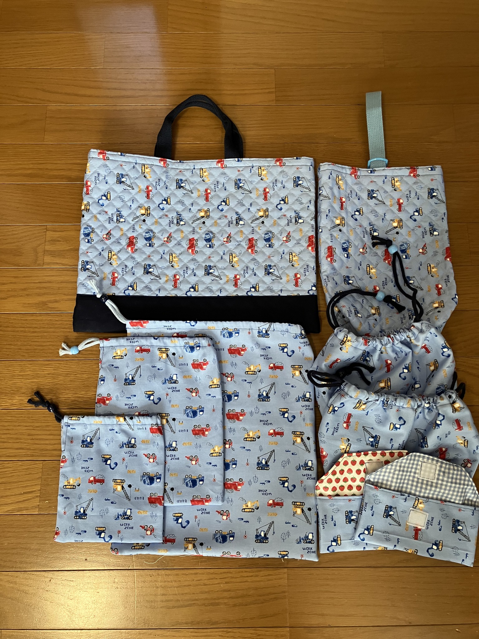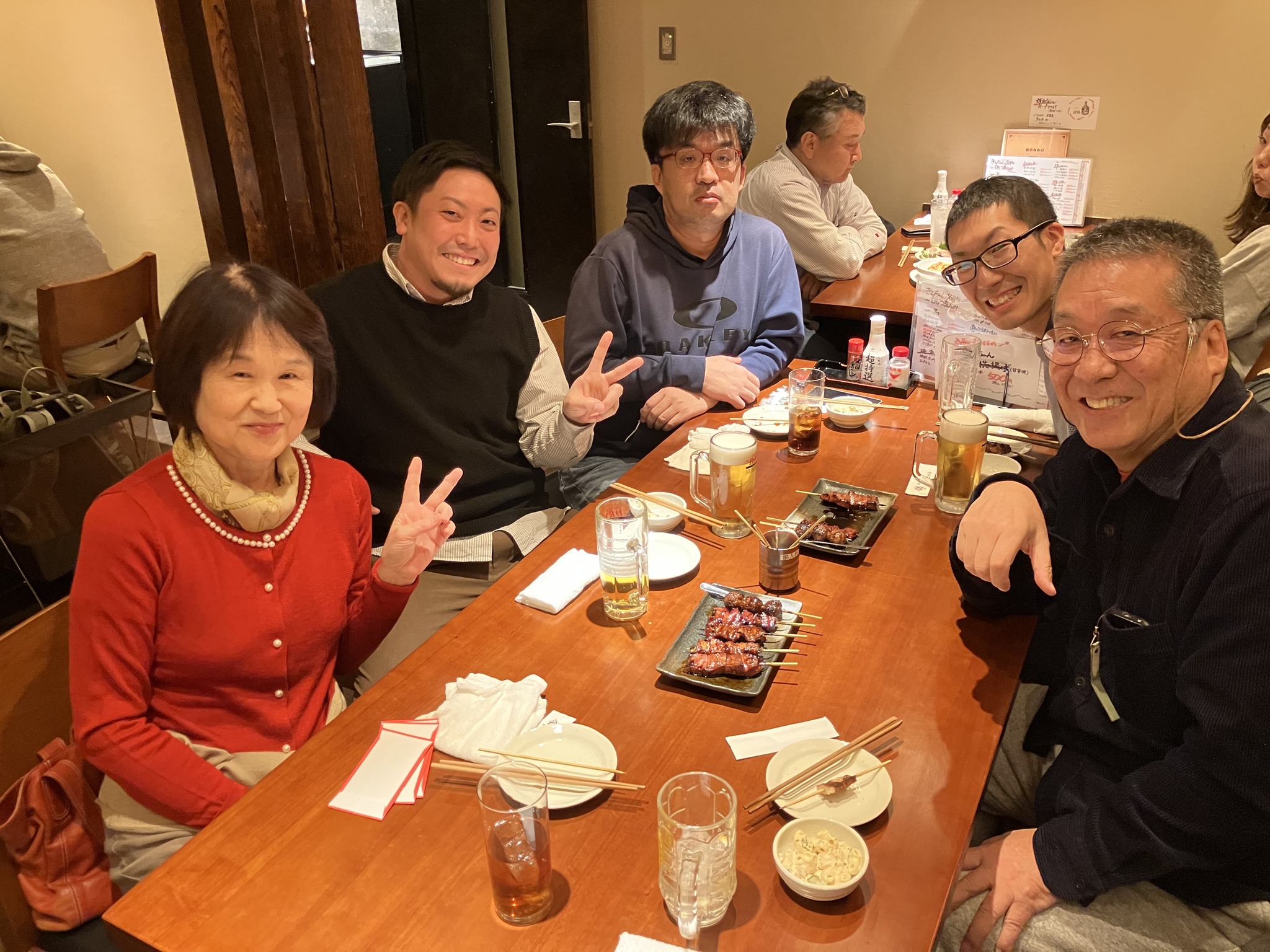 | 孫3号の幼稚園ふくろ、女房の手作り。 | 関西から甥っ子二人がやって来て焼き鳥屋で一杯。女房と長男で出迎え。 |