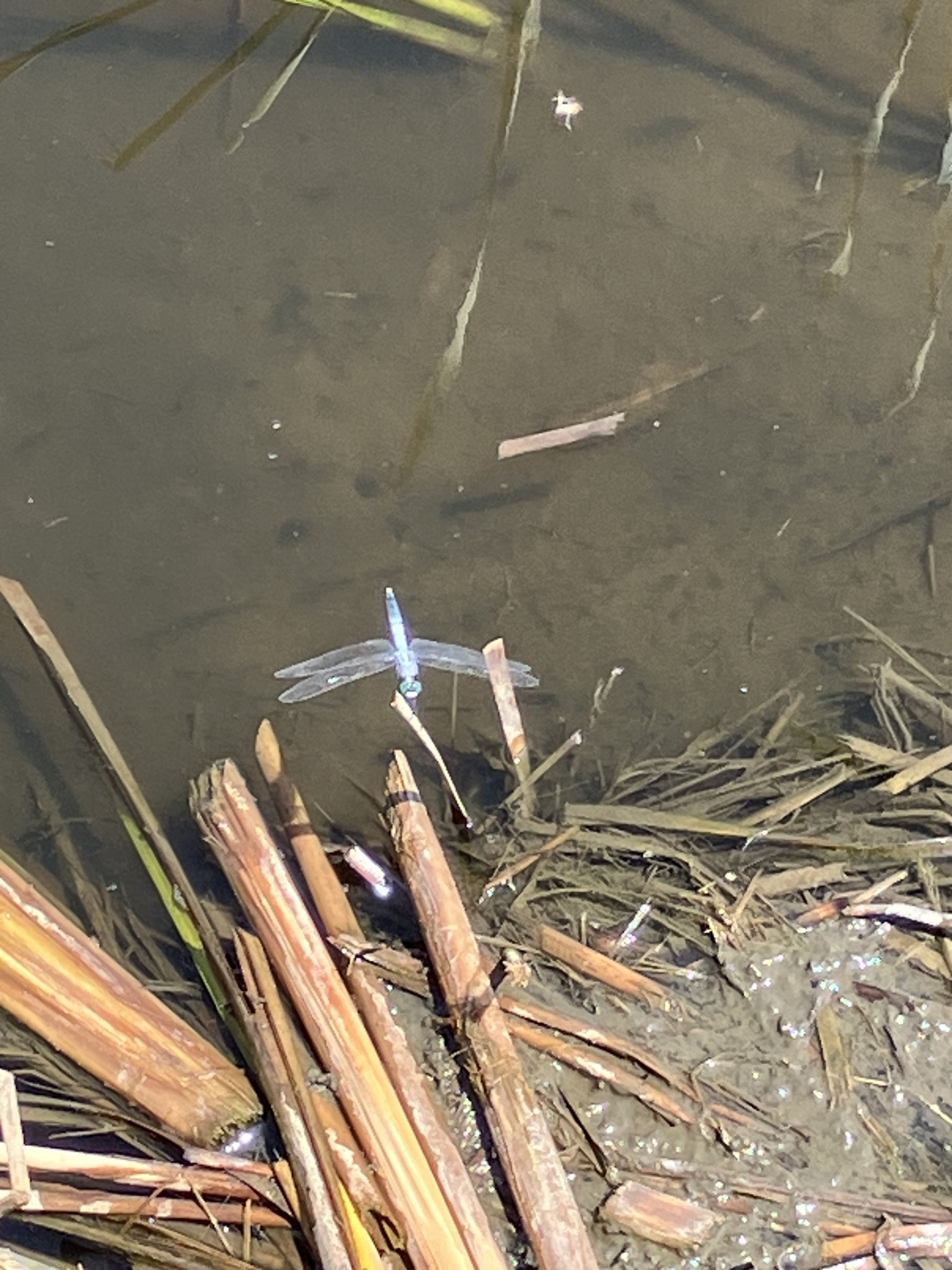 | 昨夜の雨から、久しぶりに昼間散歩に出たら、一転夏空。幾分風があり、湿度が低くなった感じで心地よい。でも暑い。 | シオカラトンボかと思ったら、BLUE DASHAR? | 国分川に小魚の群れ。田舎の川に比べて、魚影が少なくて心配していたのだ。 |