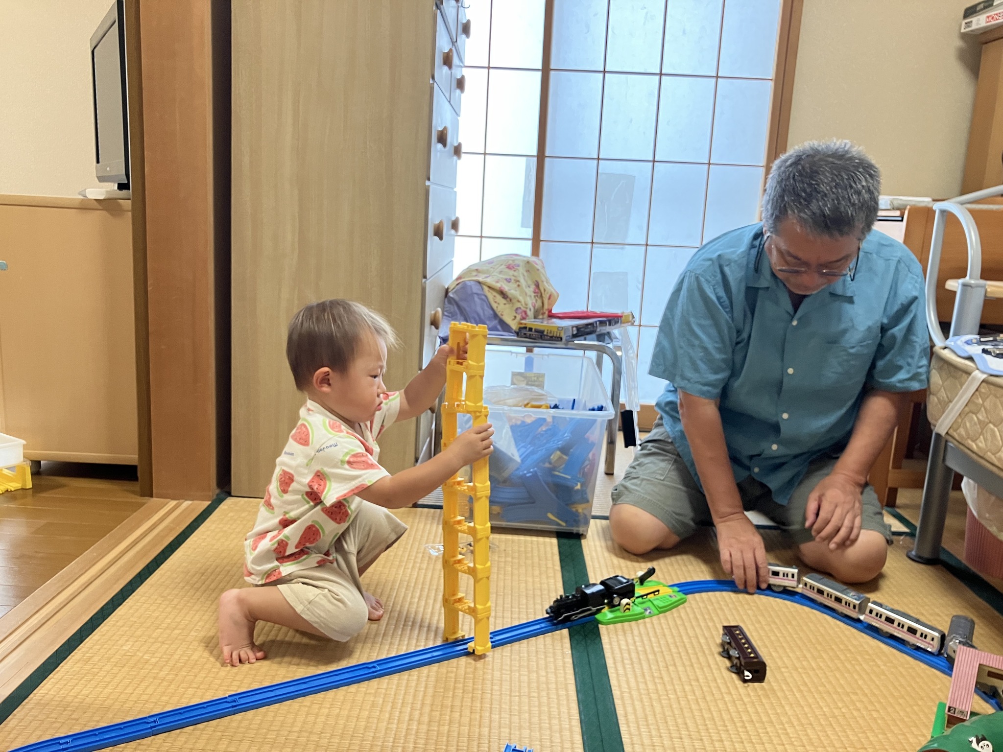 | 2歳の孫3号とプラレール 。一生懸命なのが可愛い。 | ベッドの上で大騒ぎ。 | 孫3人、時々喧嘩して泣かせるけれど仲良し。 |