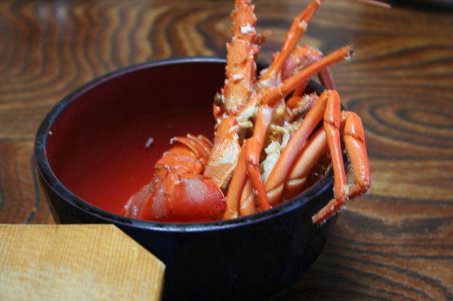 | 伊勢海老のお刺身。まだピクピク動いてます。 | 床の間、掛け軸付き。あんなに並んでつまらない店で食べる人たちが可哀そう。 | プリプリの刺身をいただきました。 | 坪庭どころじゃない。のんびりしてしまった。 | 魚の刺身盛り合わせ。長男曰く、くら寿司とは比べ物にならないね。当たり前じゃ、値段が違うわい。 |