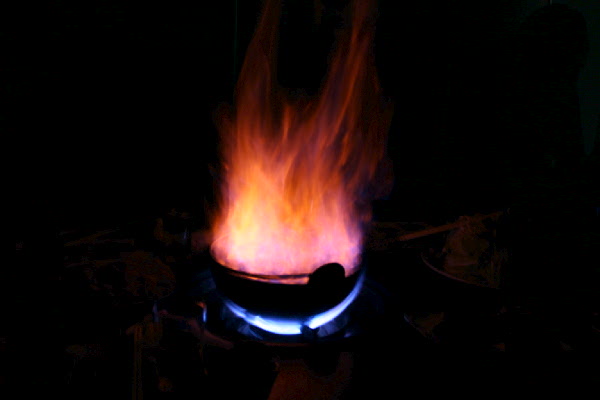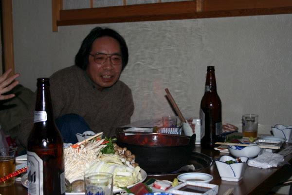 | 酒鍋に豚肉をひたすしゃぶしゃぶなんです。 | 早く早く、写真撮らなくちゃ。 | うおー。 | 暖かい。でも私はこの時気が付いた。フラッシュ撮影すると火が写って無いんじゃないか。 | そうです。実はこうなっていたのです。 |