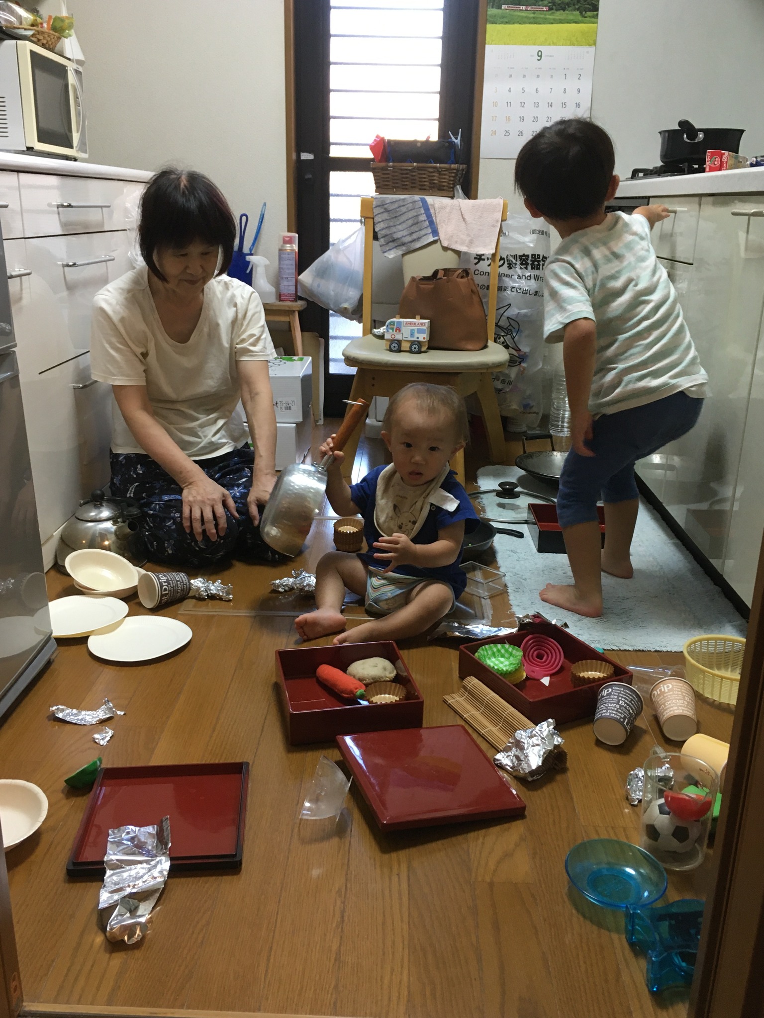 毎週火曜日は、孫1号がウチの近くのスイミングスクールに来るので、その間2号と3号とお遊び。プラレール 、トミカ 、お絵かき、水遊び、最近はママゴトがお気に入り。3号も歩くようになって兄と同じ事をやりたがる。