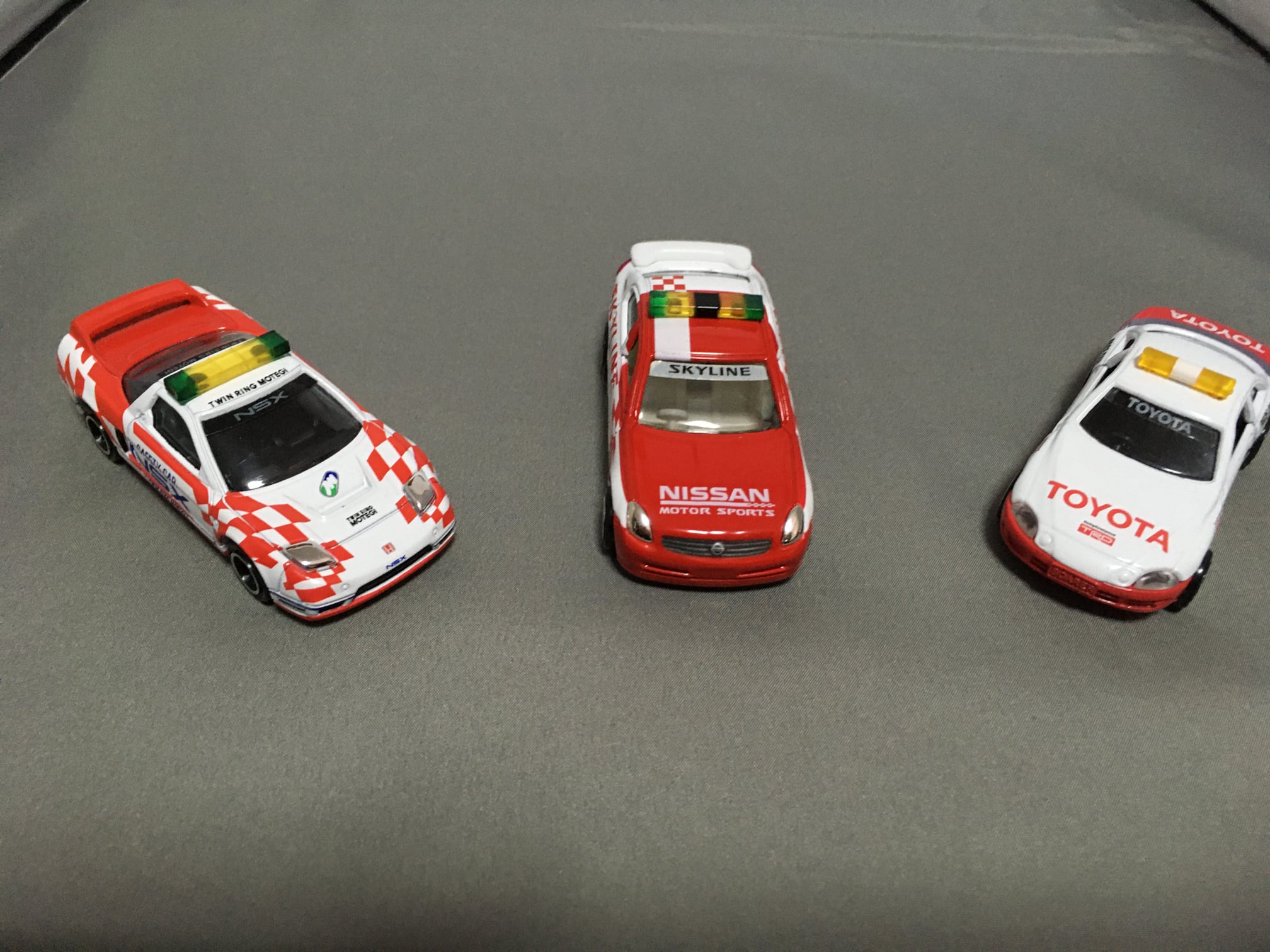 | ちょっと乗せてもらいました。残念ながらエンジンは掛けられません。 | KENWOODポルシェとルマンで優勝したレナウンチャージマツダ787B。私の計画では数年後に東レサードレーシングチームでルマンに出ることになっていたのだけれど。 | ホンダ、日産、トヨタのセイフティカー達。 |