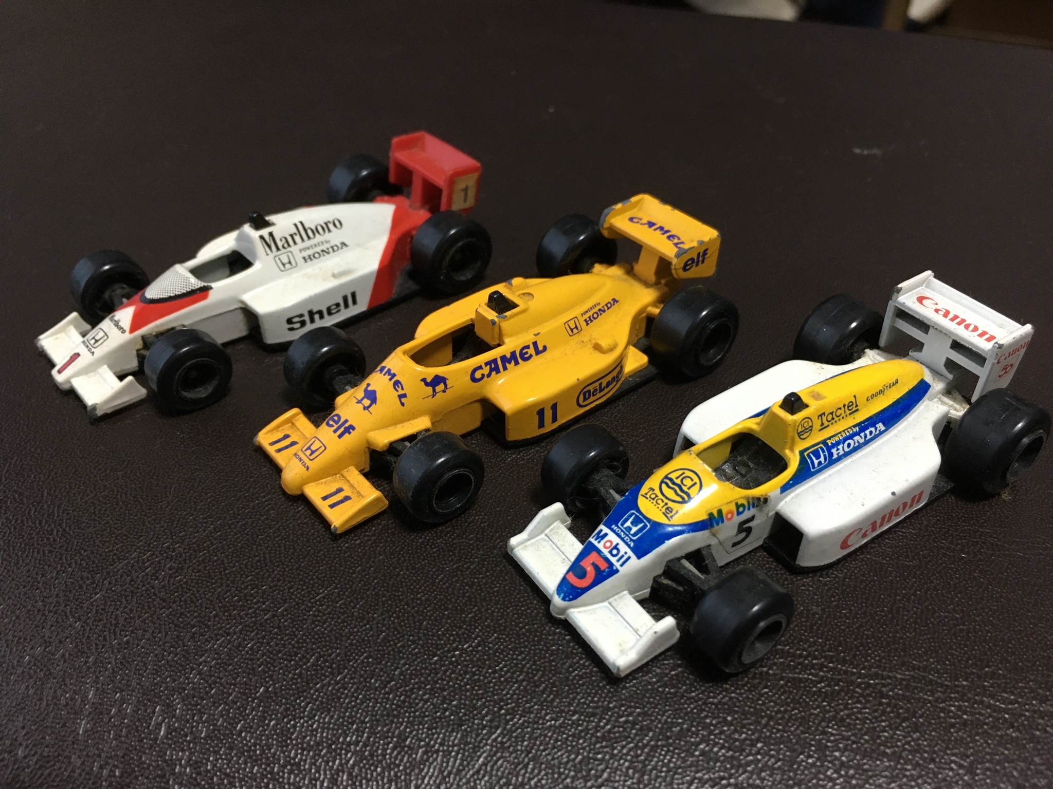| 左からマクラーレンホンダ、ロータスホンダ、ウィリアムズホンダ。 1986 年に東レサードレーシングチームをスポンサードする時、ウィリアムズホンダからも打診があったが、両サイドに'TORAY'のステッカーを貼るだけで一億円。とても出せませんでした。 | ウィリアムホンダのベネトンフォーミュラとJPSロータスフォード。 |