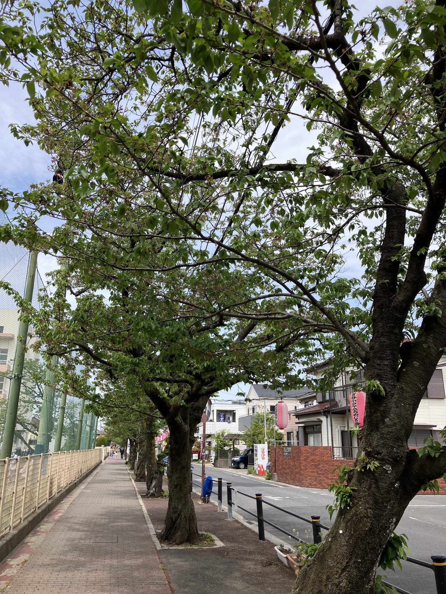 | 桜並木の染井吉野はすっかり葉桜になった。これも生き生きしていて好きな風景だ。 | 楊貴妃桜は残念。この1週間でほとんど散ってしまった。なかなか花吹雪が見られない。 | また来年までのお預けだ。 | この花びらが一斉に風に舞うと、物凄い花吹雪になる。あっ逆だ、物凄い花吹雪の名残りが地面に。 | いつもの調整池にはでかい青鷺がいた。 |